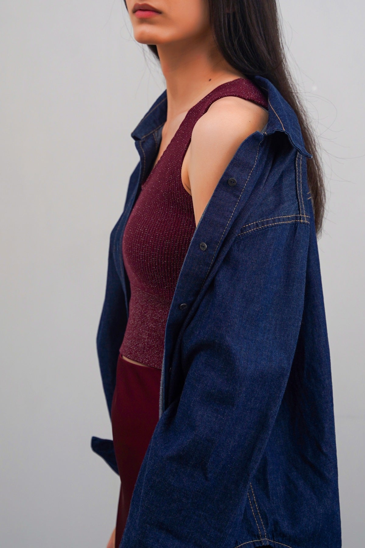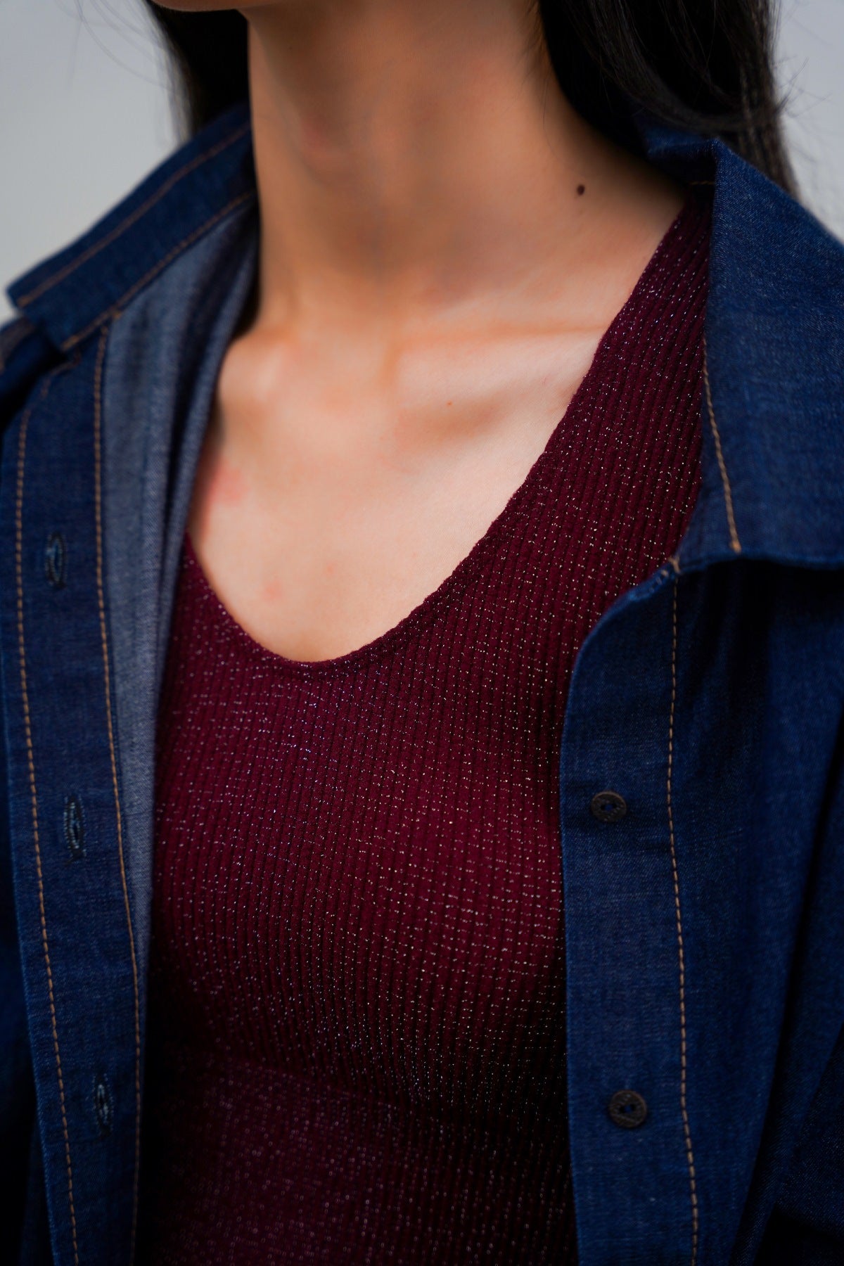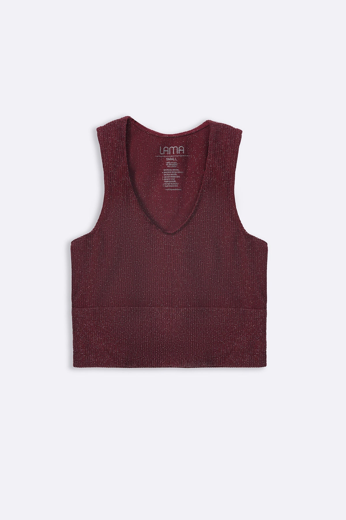 Design details: A sleeveless tank top with a scooped neckline and lurex weaving.