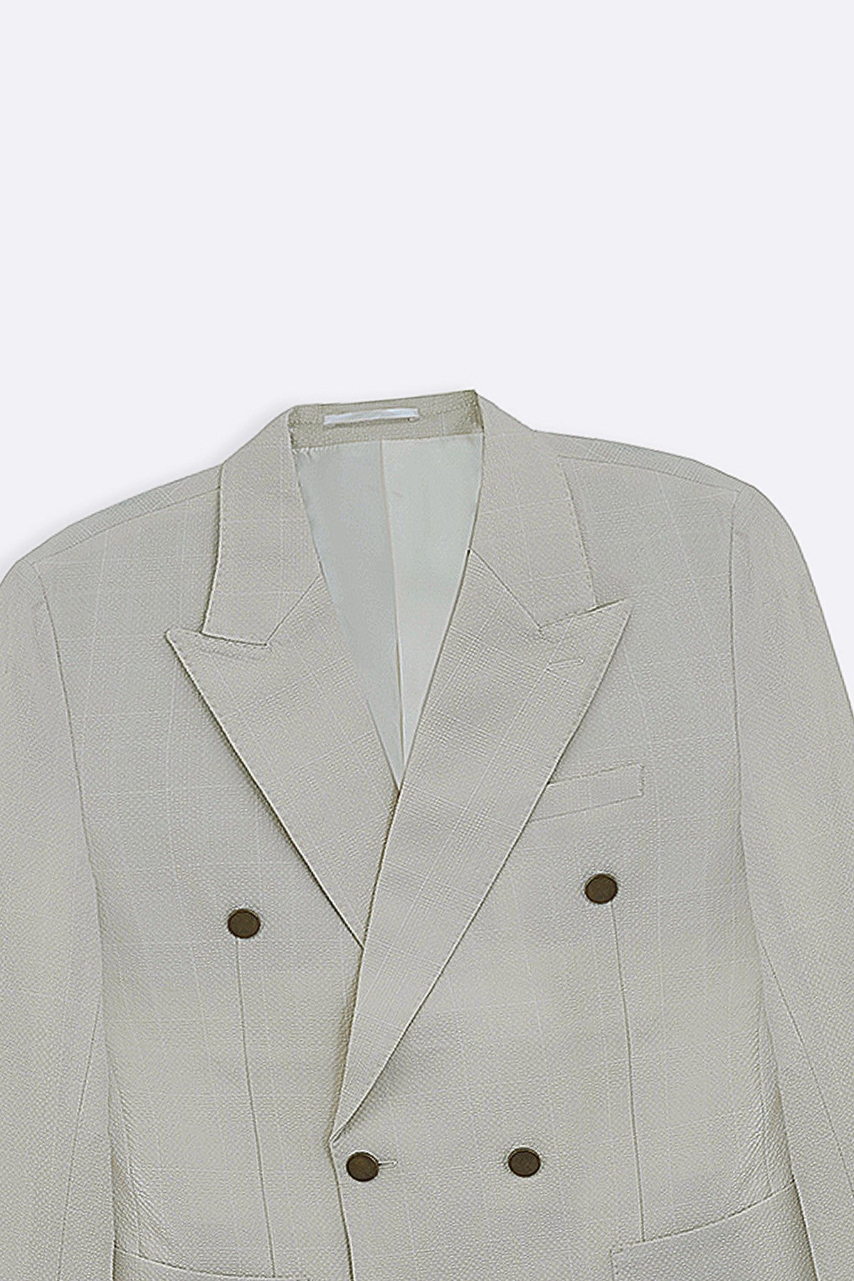 Design details: Double breasted seersucker blazer with a peak lapel, two patch pockets and a chest bone pocket. Front button closure and double rear vents.