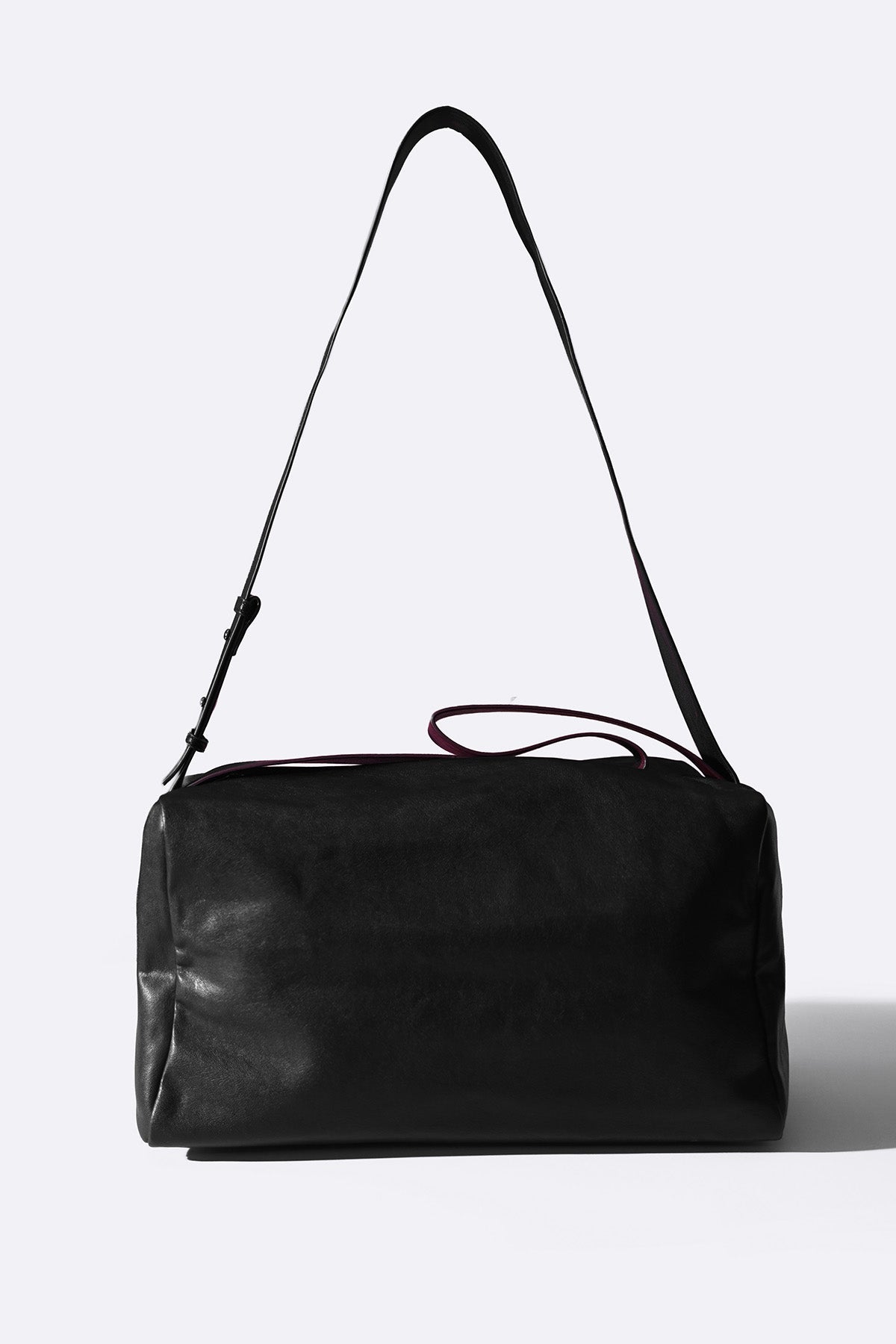 Boxy duffle bag with a phone pouch inside, internal / external zipped pockets and an adjustable shoulder strap.Dimensions: 16x9 inchesMaterial: Vegan leatherNote: The product's actual color may vary slightly from the image.