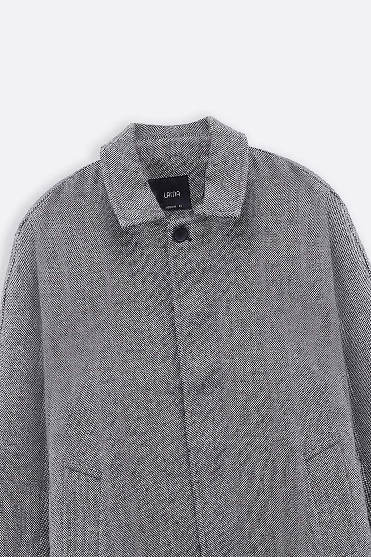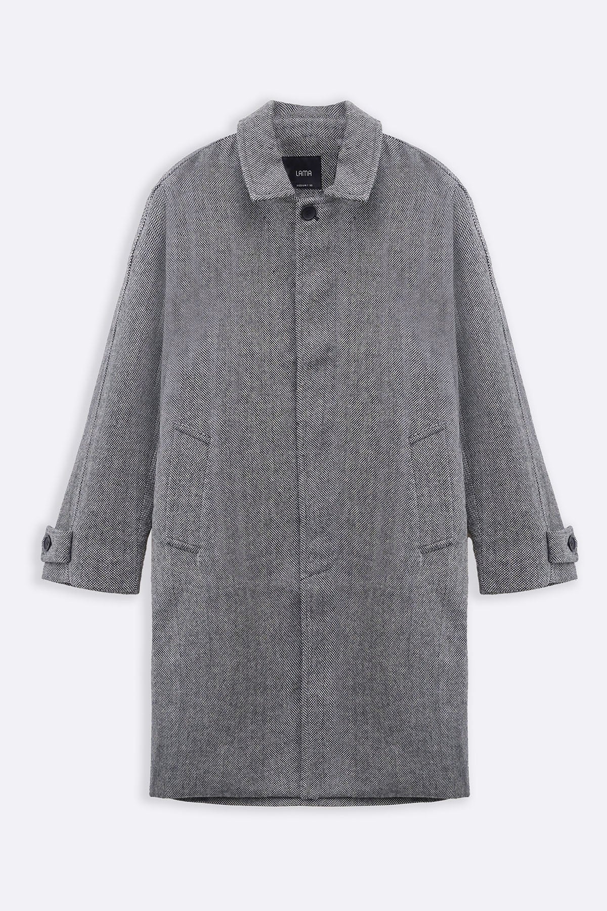 Design details: Long tweed overcoat with a hidden button placket, collar and bone pockets at the front.