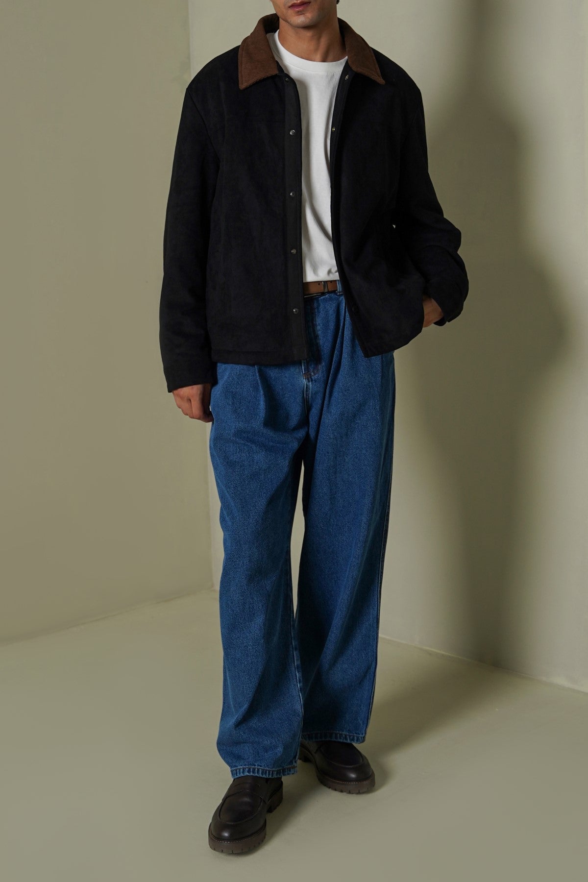 Design details: Suede jacket with contrast corduroy collar, quilted lining, front bone pockets and a lining pocket. Front snap button closure.