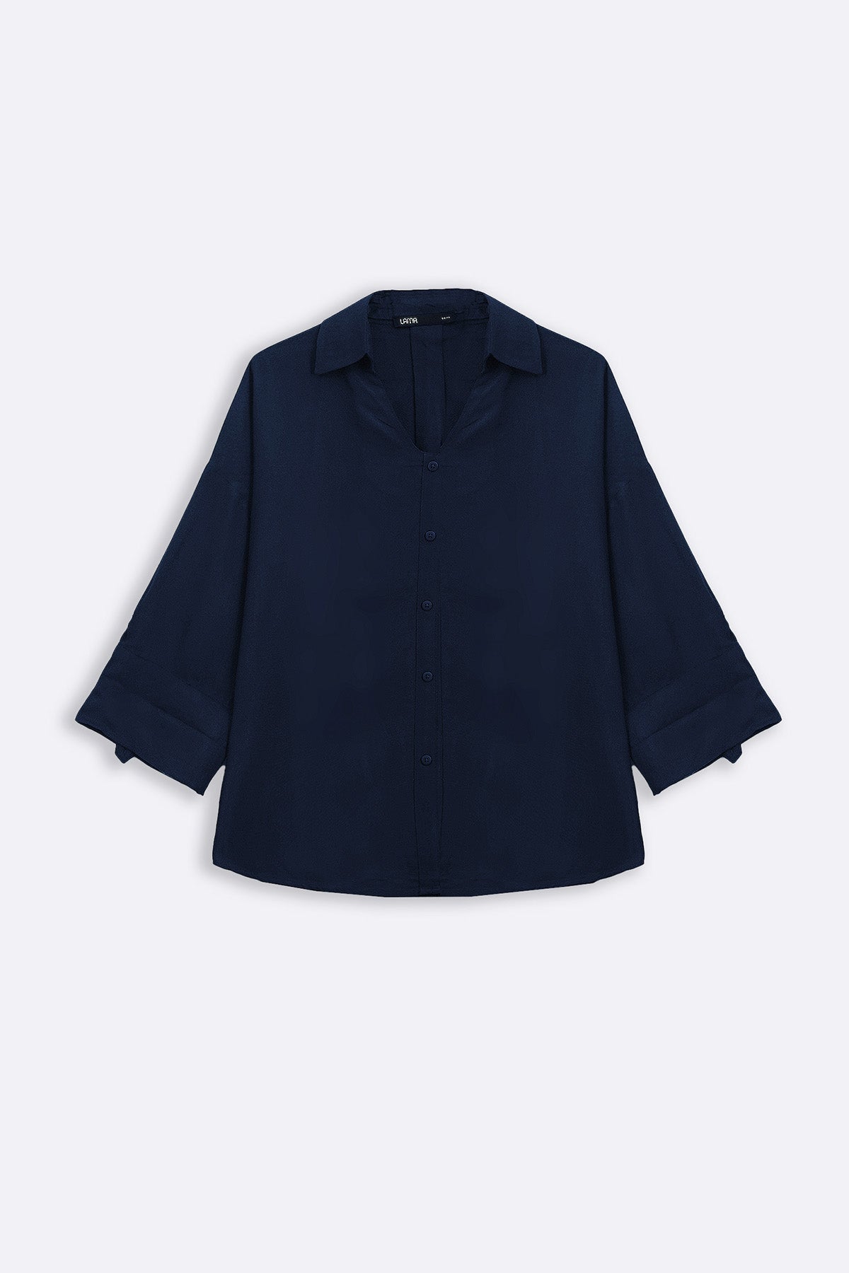 Design details: Collared V neck top featuring turn-up sleeves with loop detail, a front placket with fabric buttons and side slits.