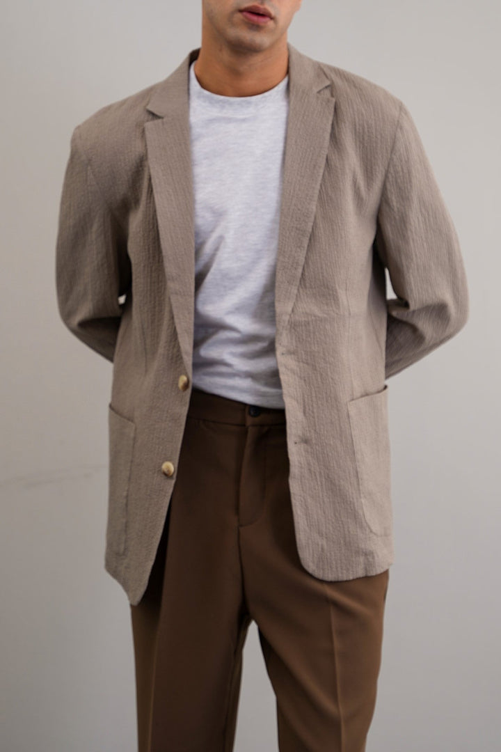 Design details: Light-weight, non-structured, single-breasted blazer with half lining and side patch pockets. Front button closure and a single rear vent.
