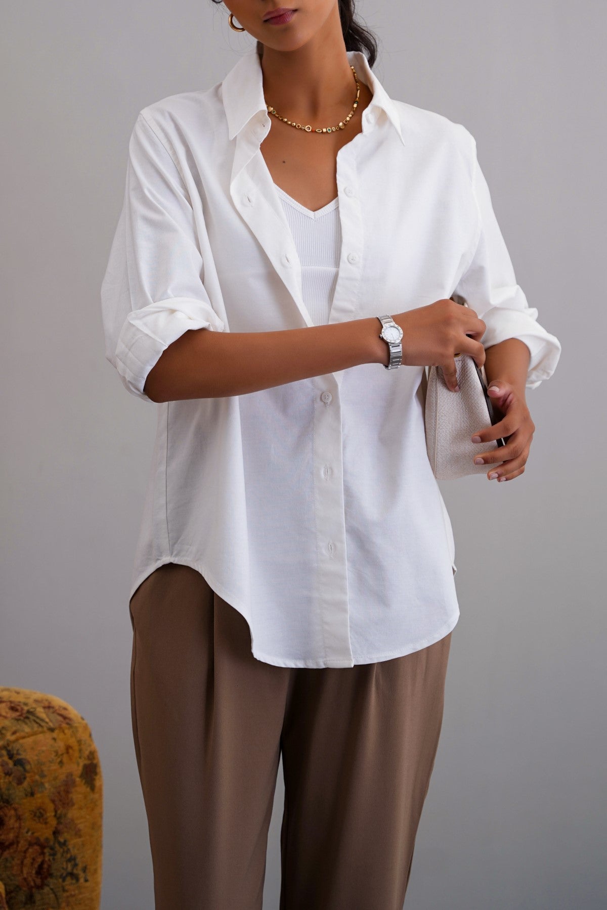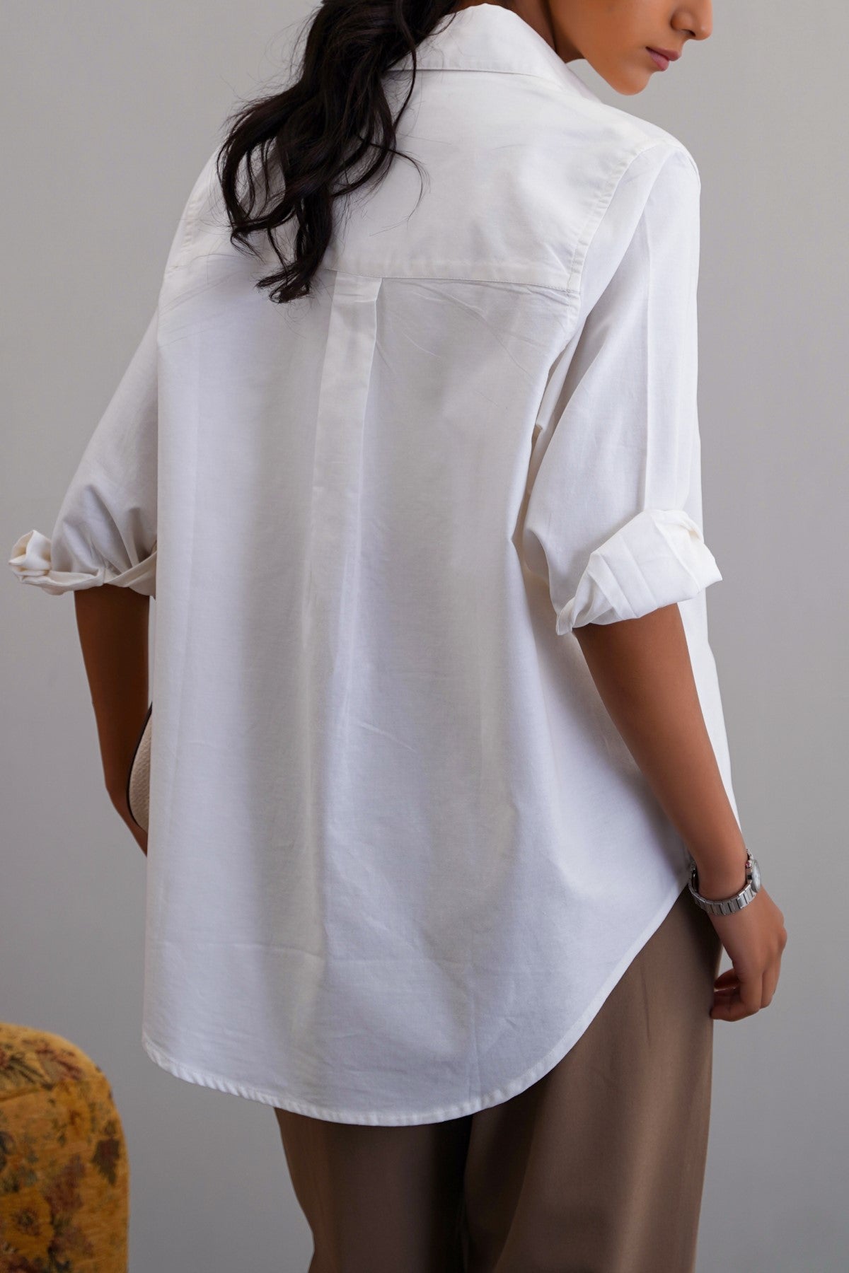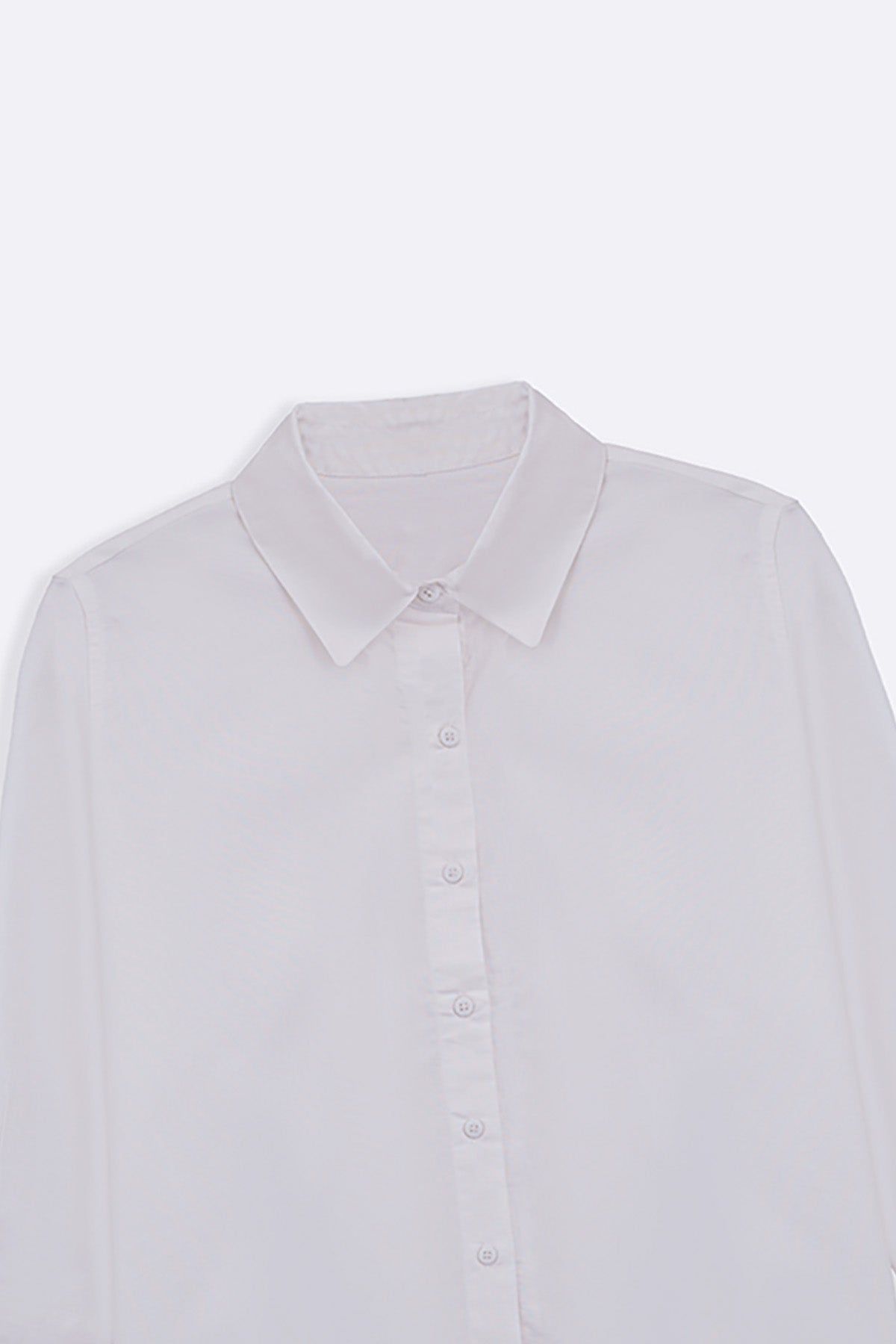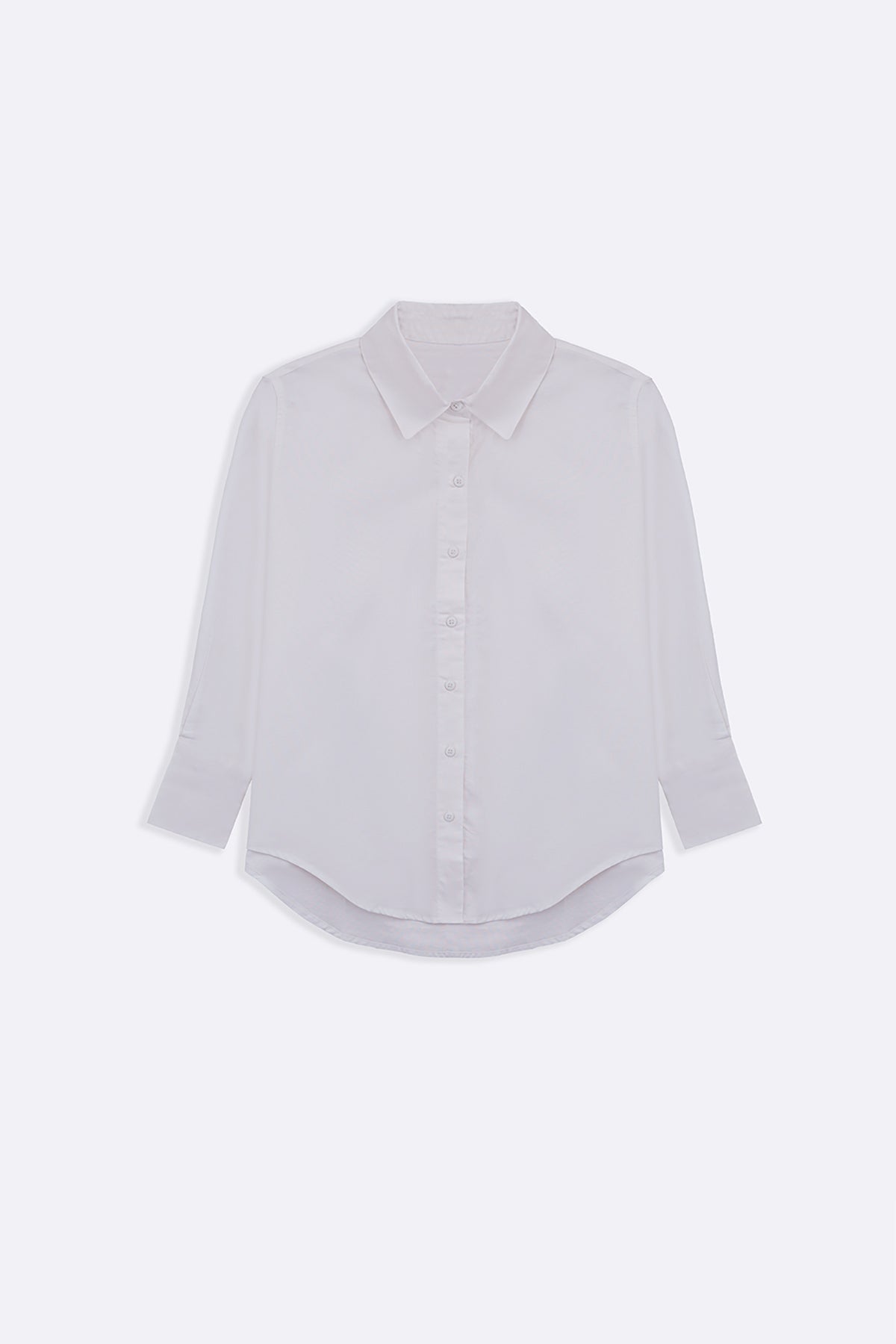 Design details: Collared button up shirt with cuffed sleeves, high-low rounded hem and back pleat detail.