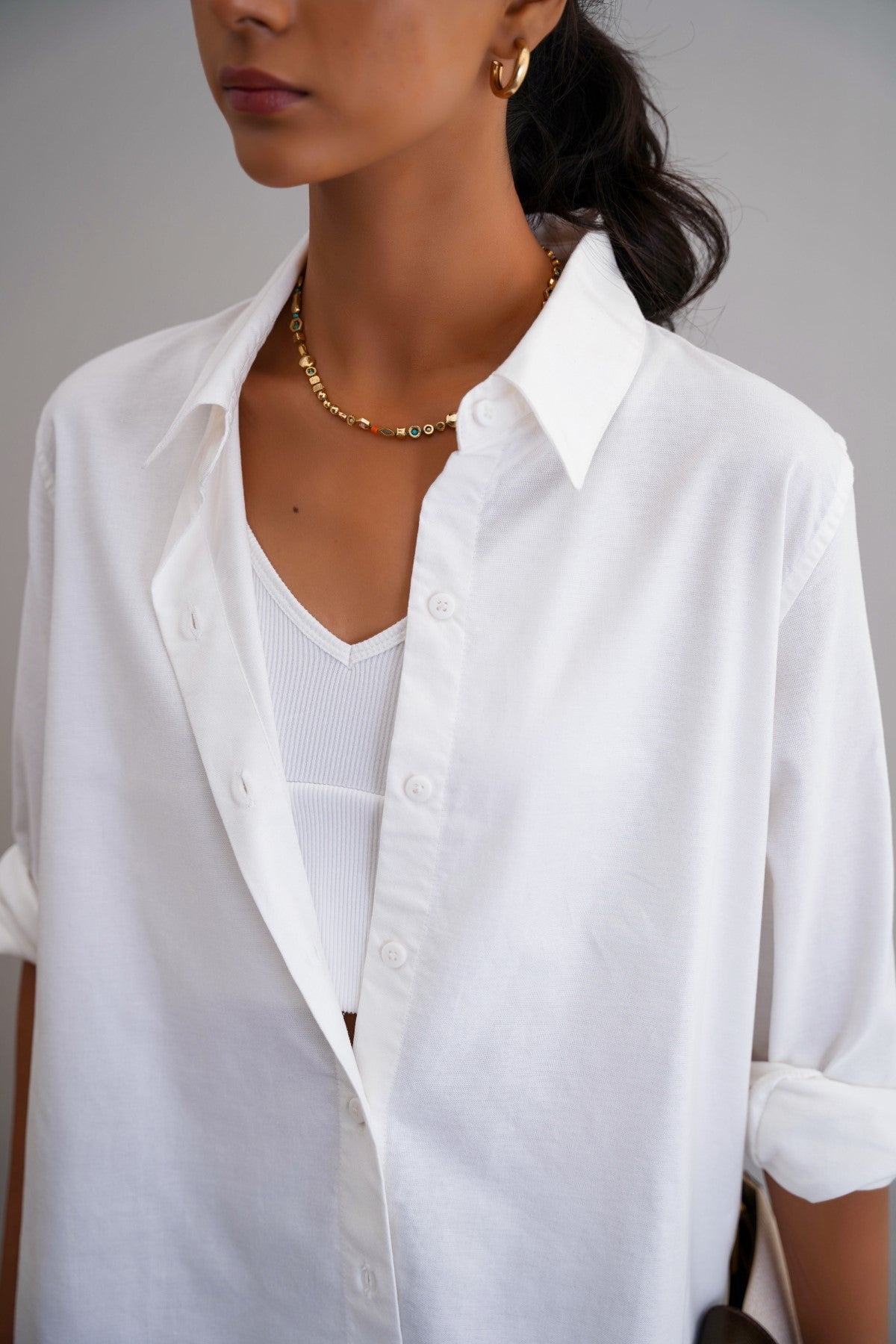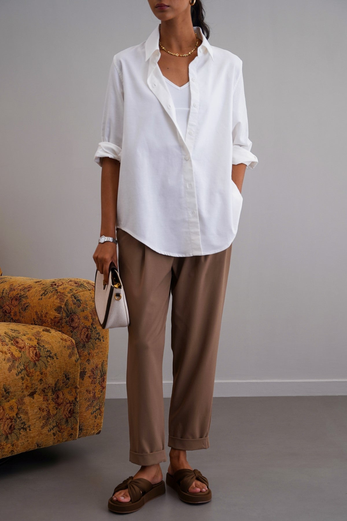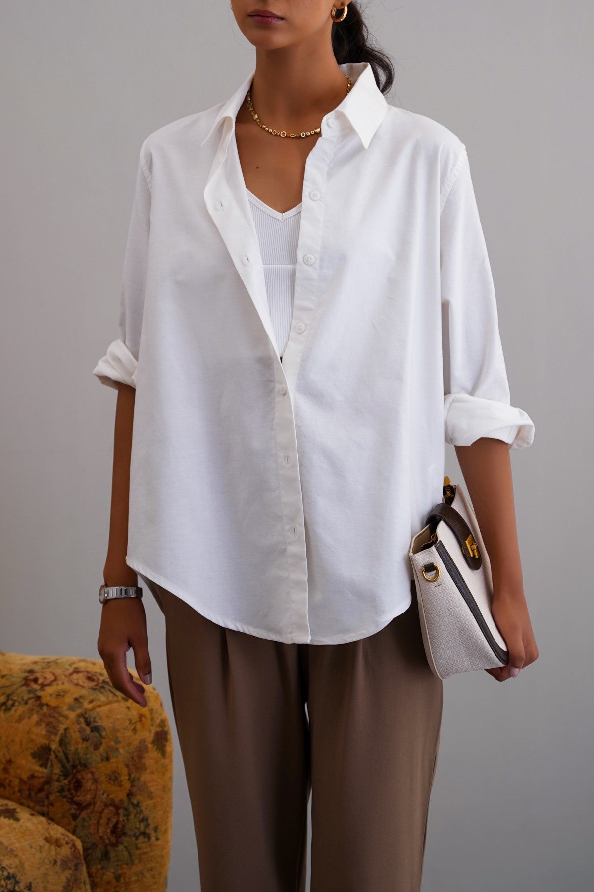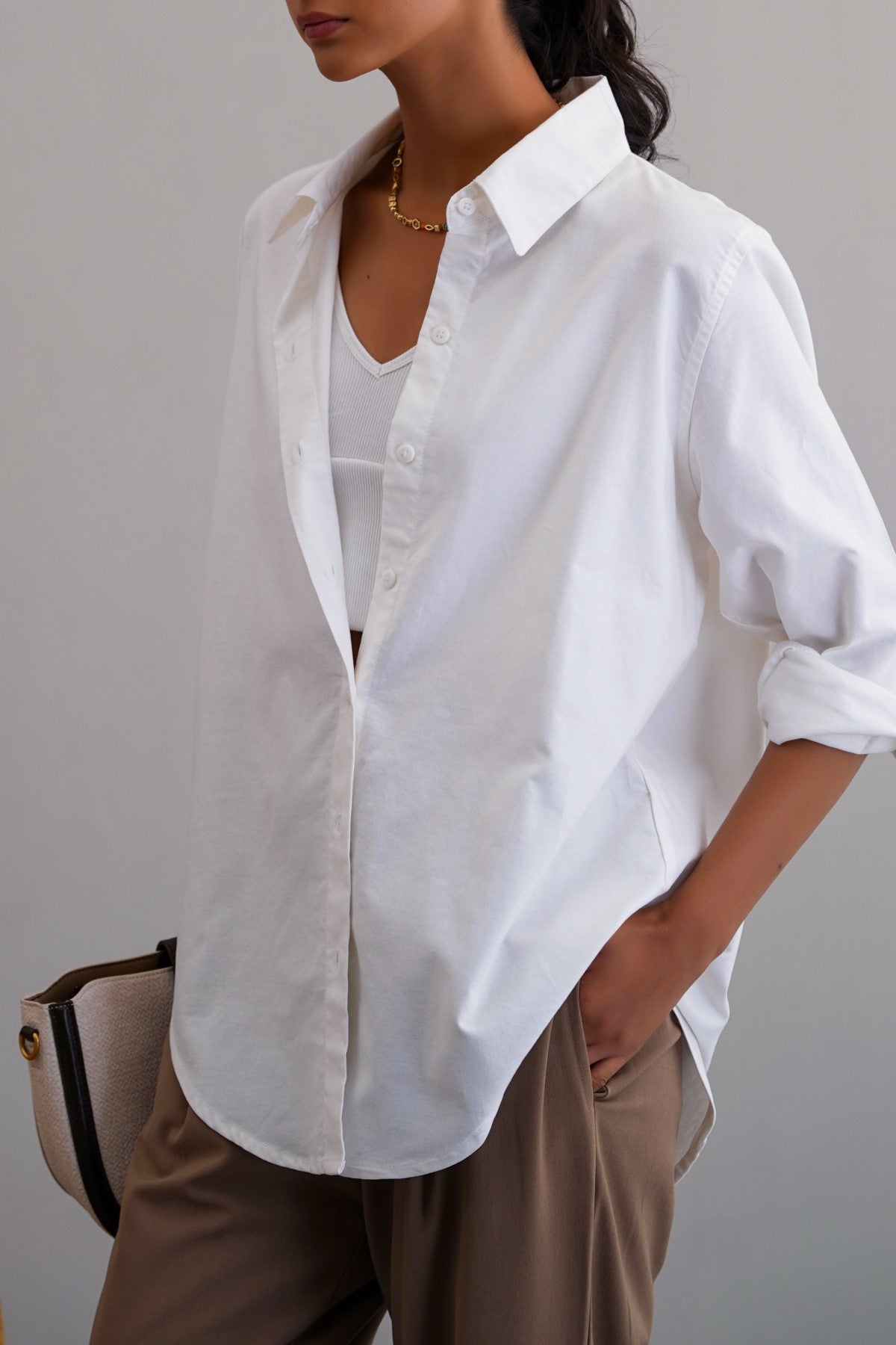 Design details: Collared button up shirt with cuffed sleeves, high-low rounded hem and back pleat detail.