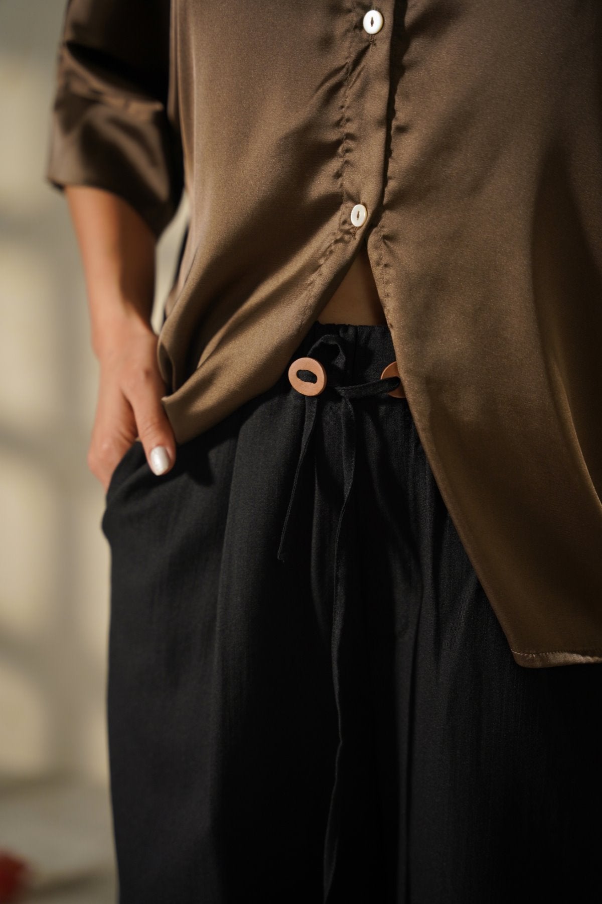 Design details: Collared blouse with short wide sleeves and front pearl button up closure.