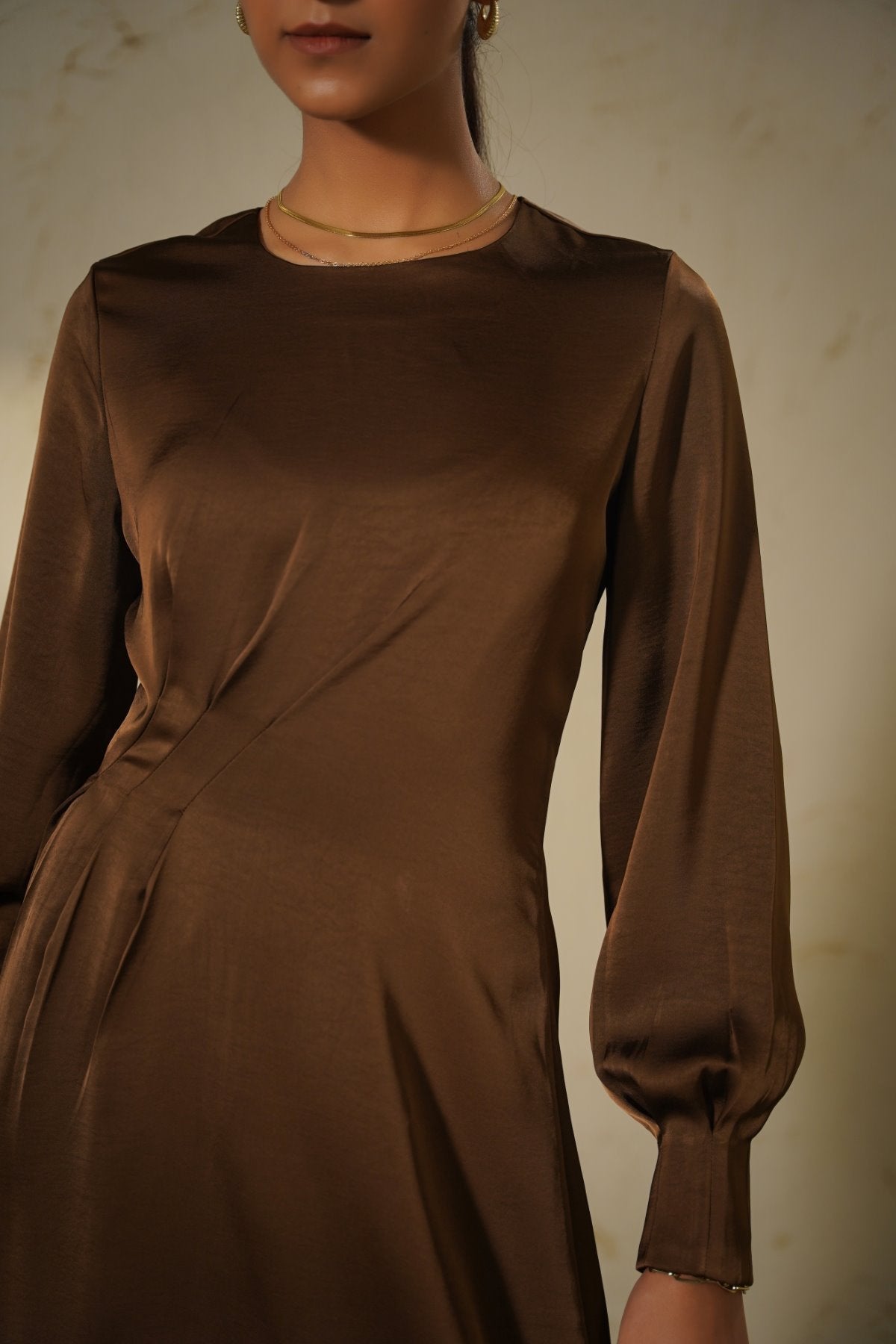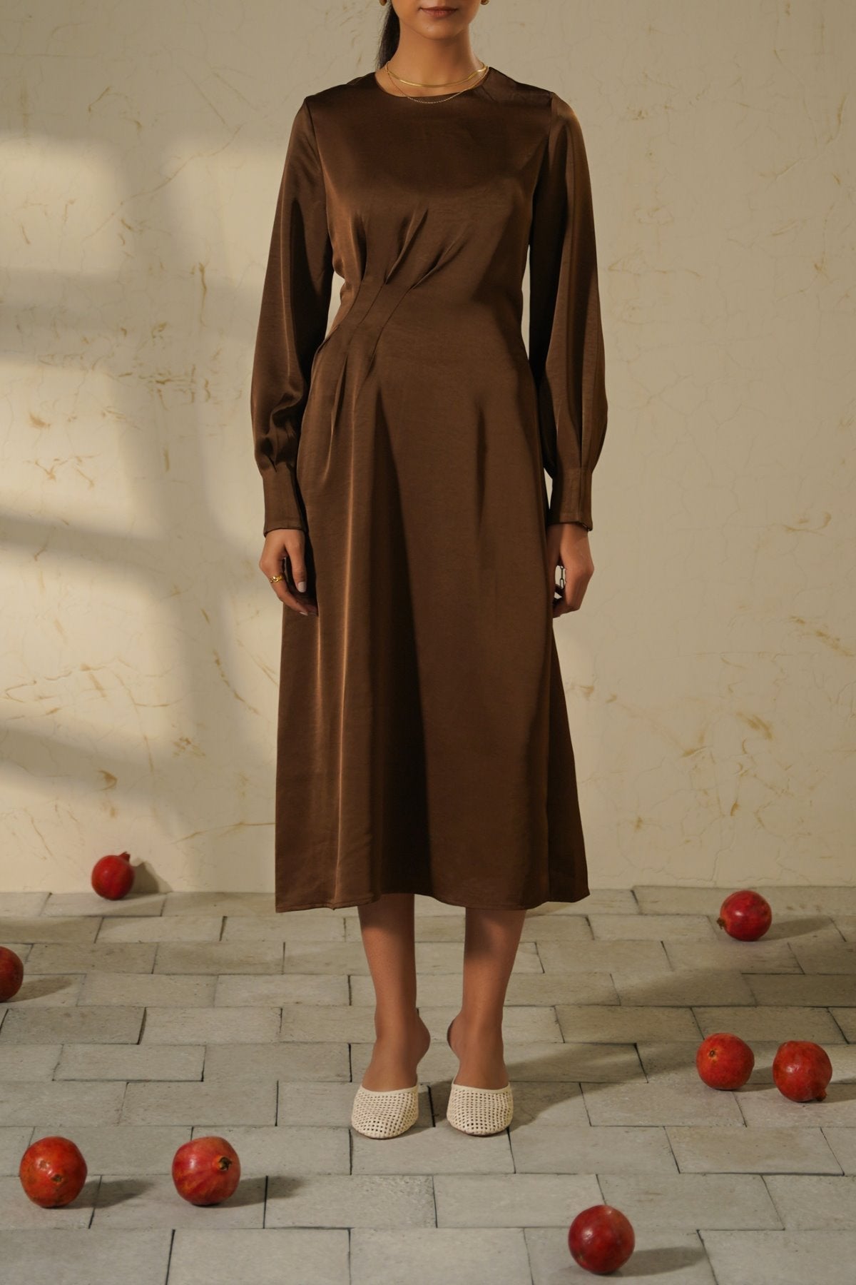 Design details: Full length dress with a round neckline, long sleeves with cuff detailing, and pleats at waist for a cinched shape.
