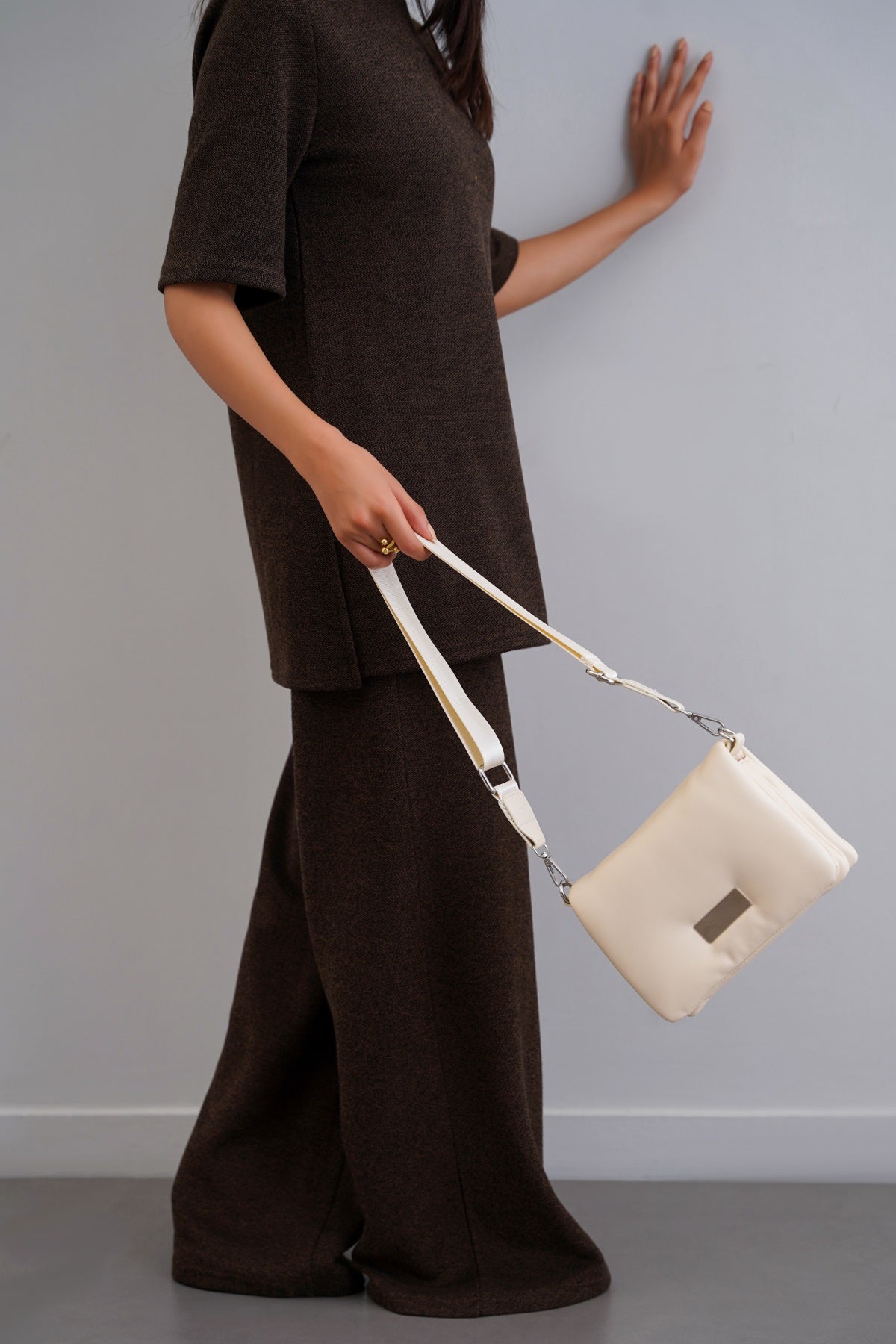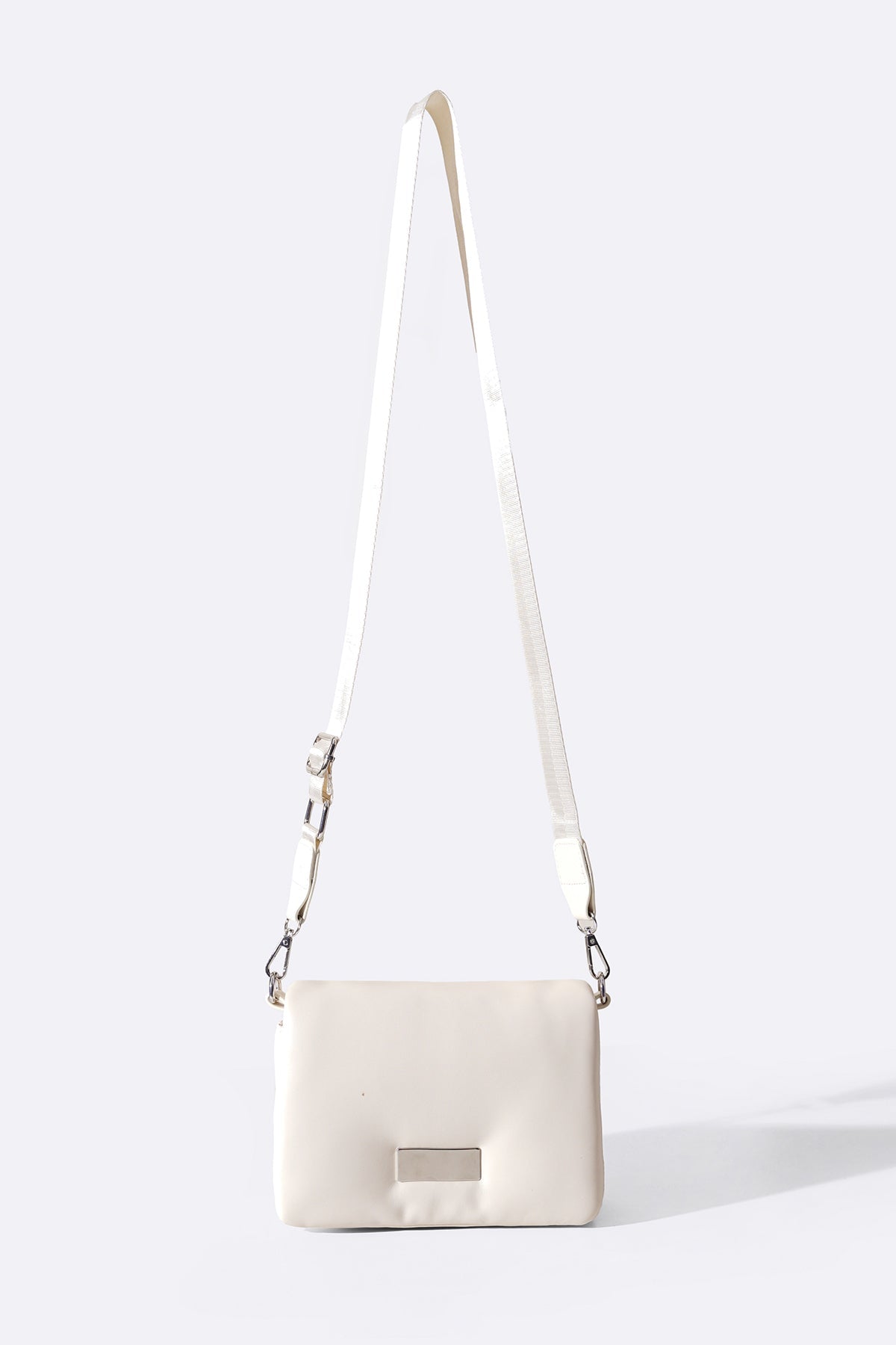 Pillow soft and convenient crossbody bag with meatllic plate at the front, an adjustable, detachable wide matching strap and two main zip pockets to hold your belongings. It comes with an inside slip pocket and has a magnetic snap button closure.