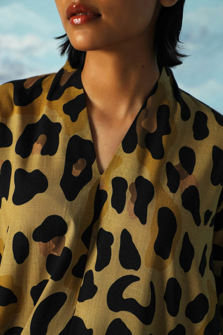 Design details: Long printed V-neck dress with front box pleat, lantern sleeves and side pockets.