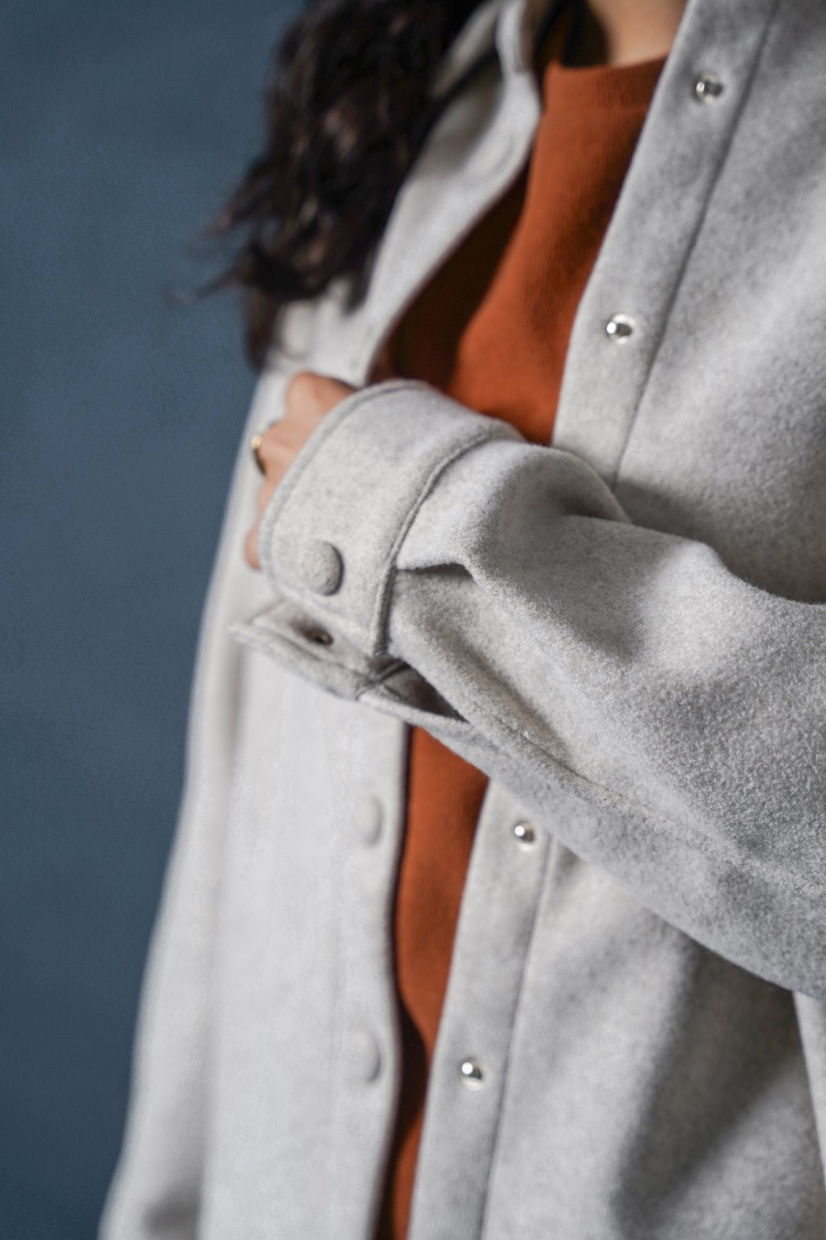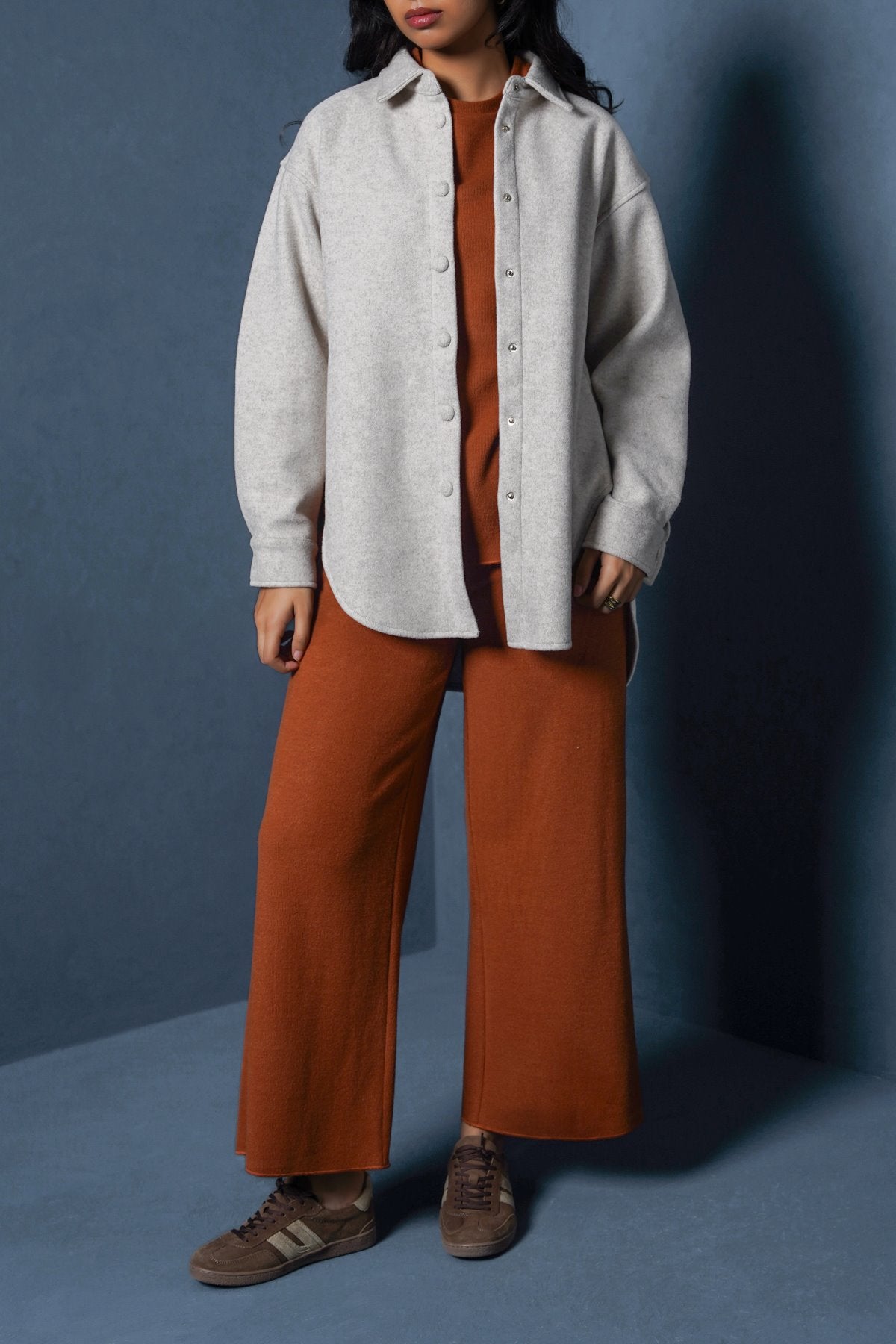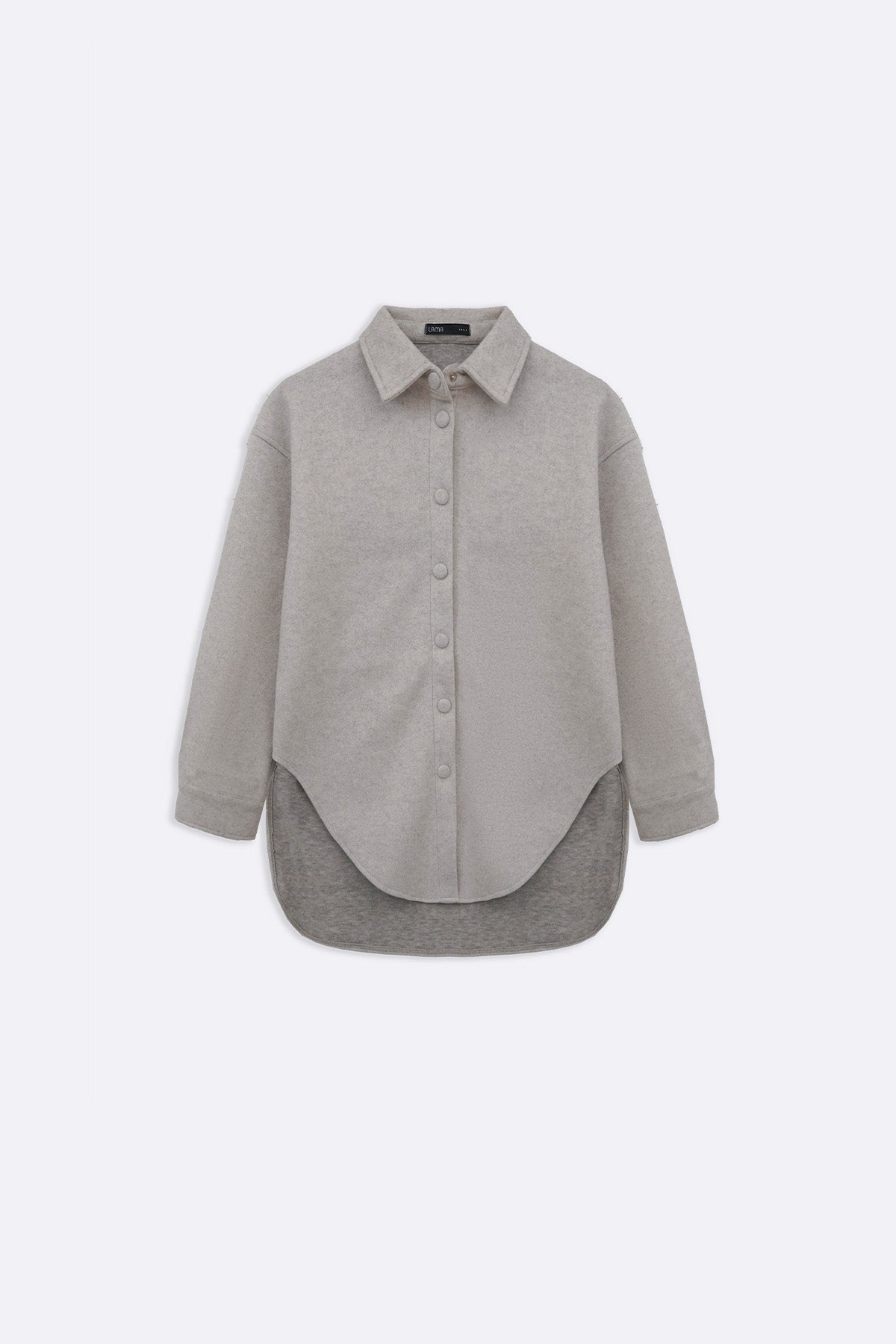 Design details: Collared shirt with cuffed sleeves, curved high low hem and front snap button fastening.