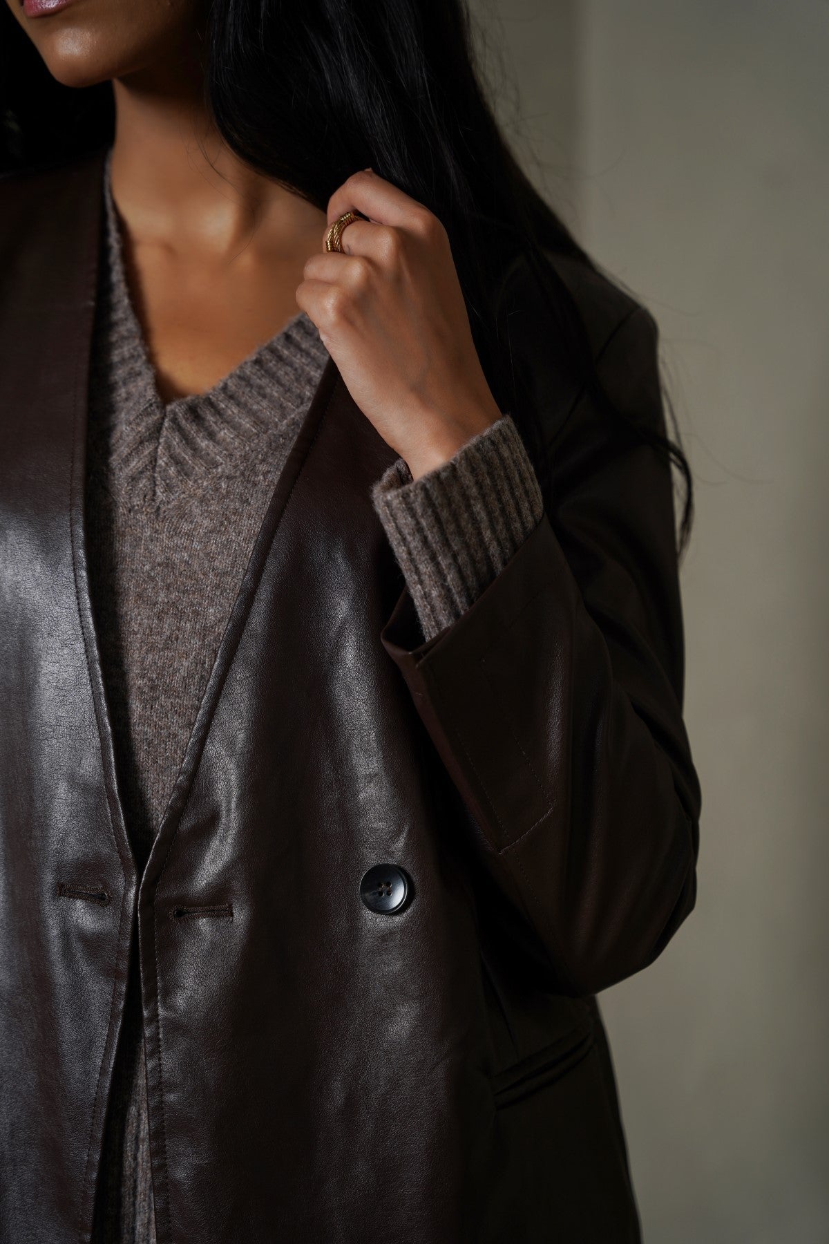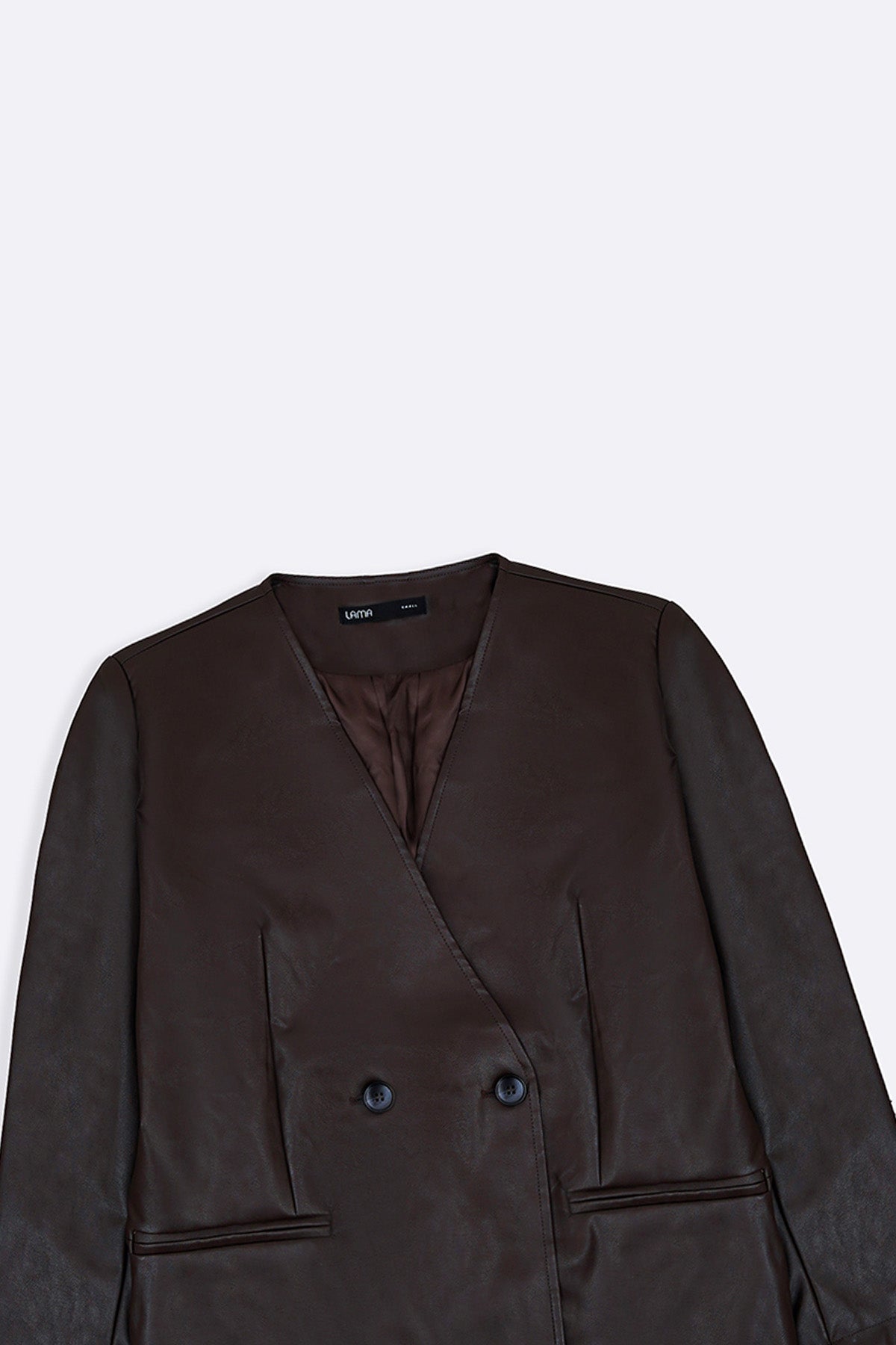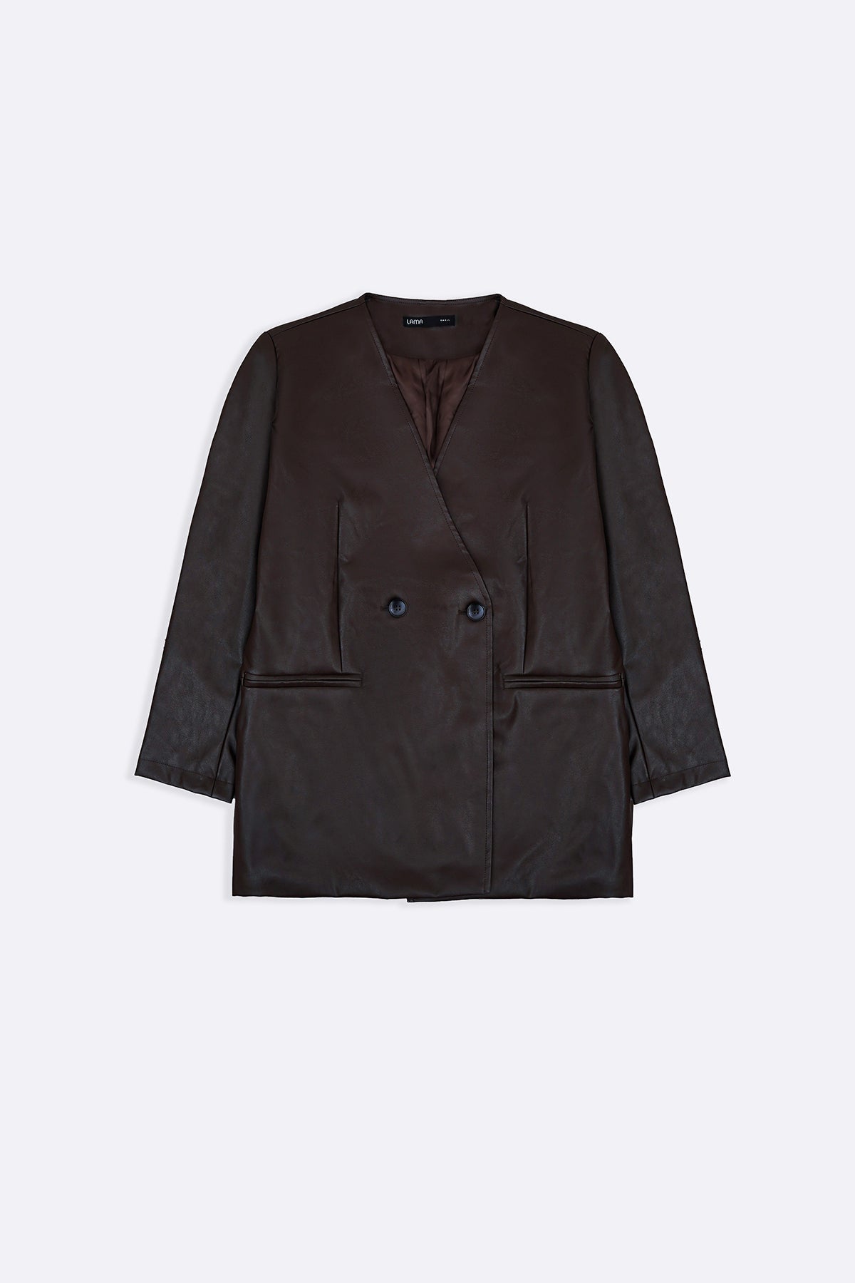 Design details: Collarless blazer with a double-breasted button fastening and front welt pockets.
