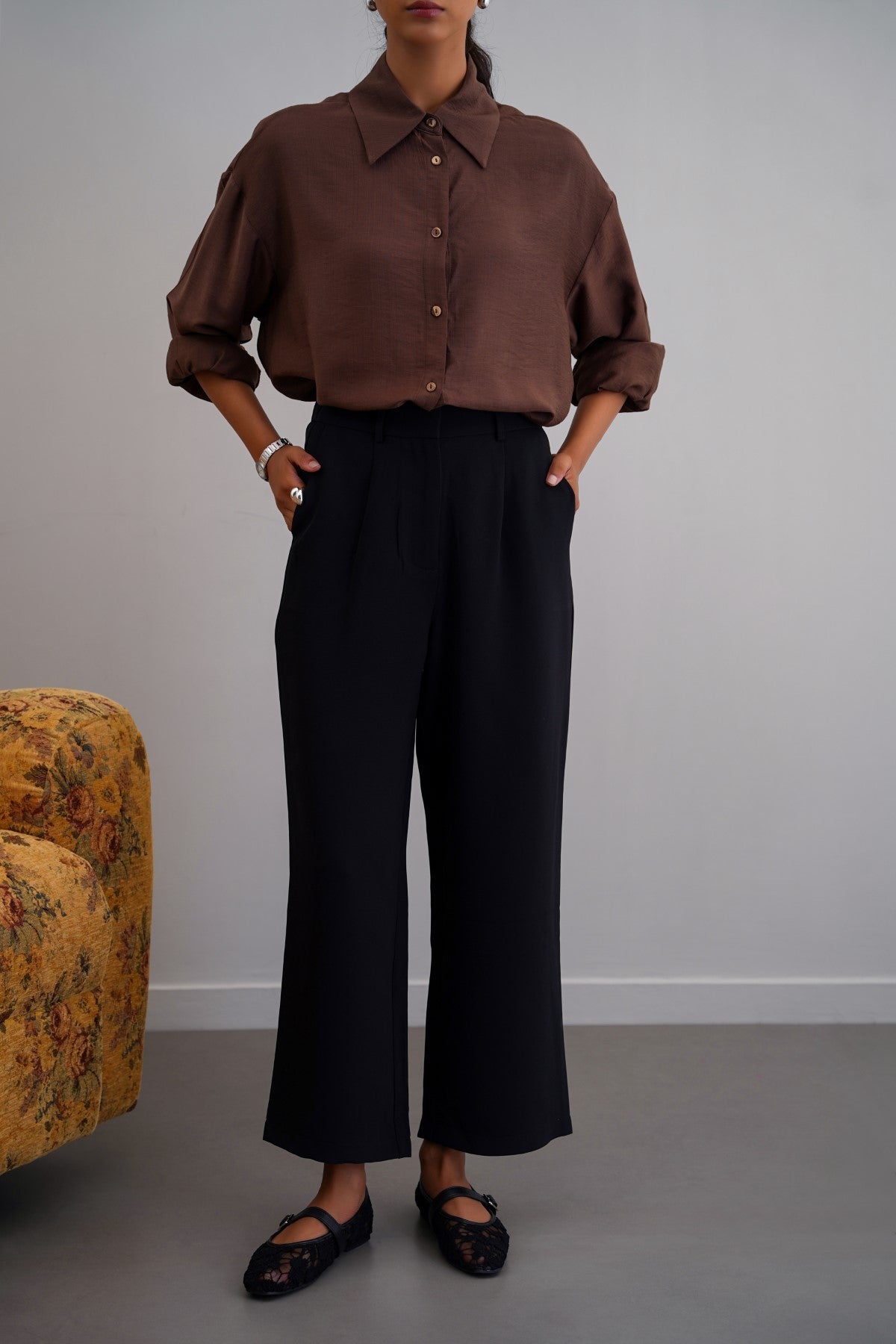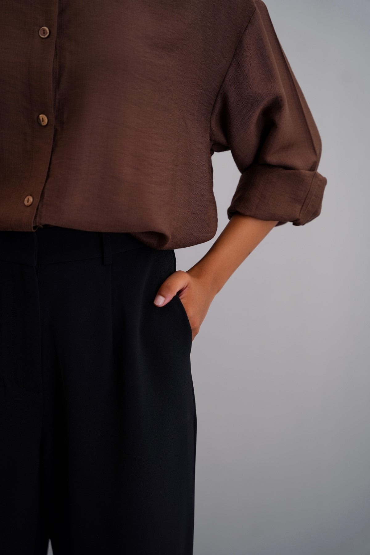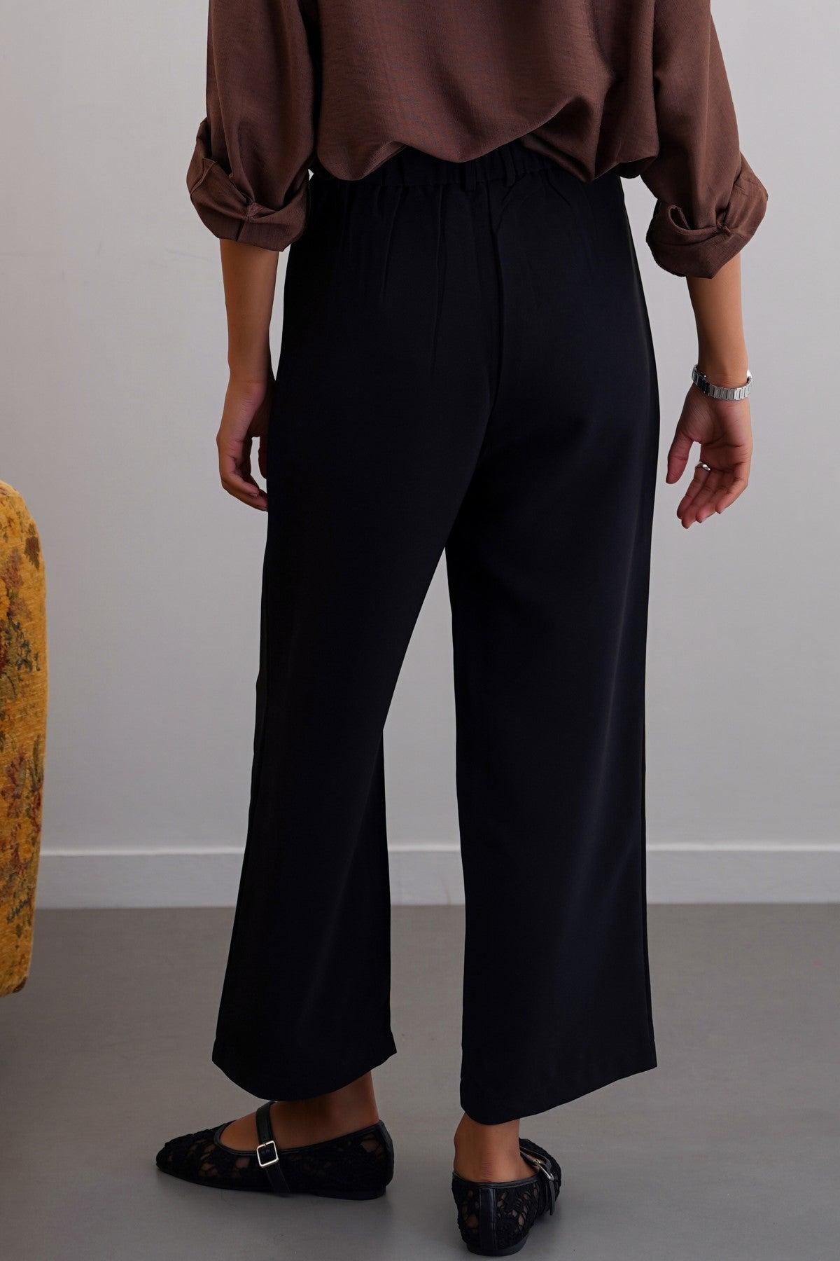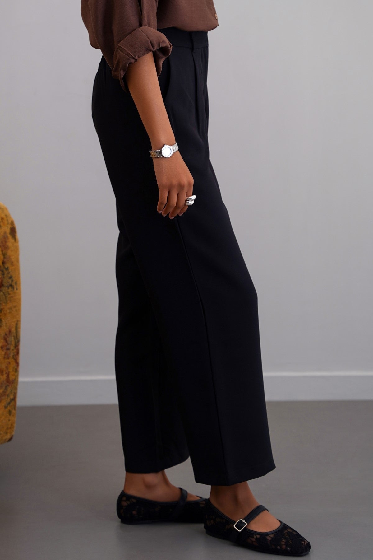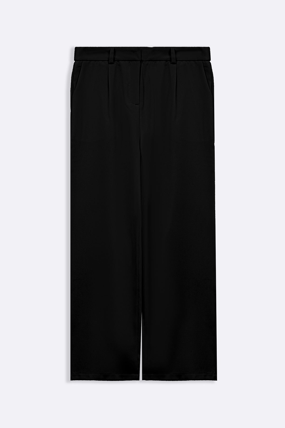 Design details: Pleated pants with front side pockets and an elasticated waistband at back.