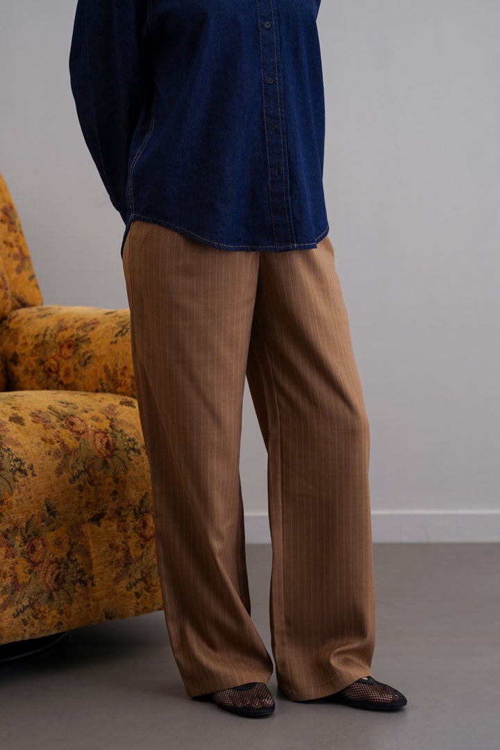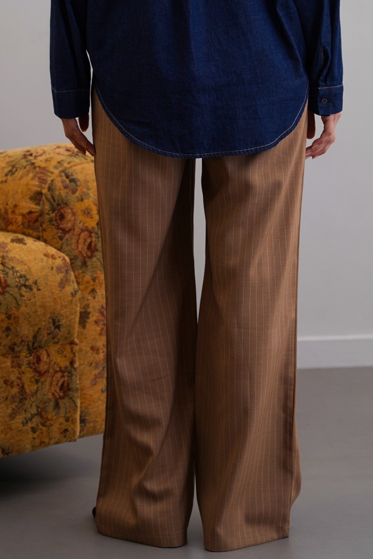Design details: Pleated pants with front side pockets and an elasticated waistband at back.