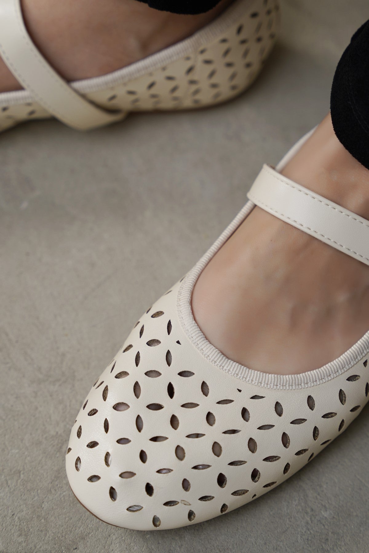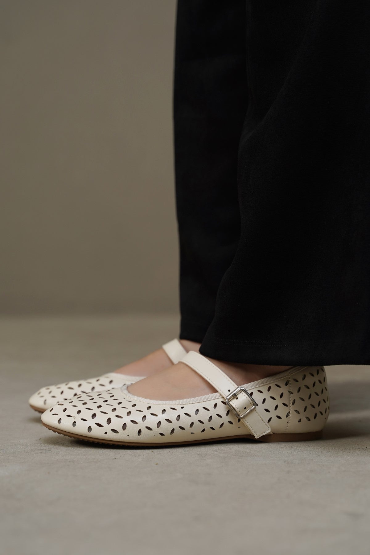 Soft lazer cut Mary-Jane pumps with soft cushion at the back counter, comfortable insole and anti-slip outsole.