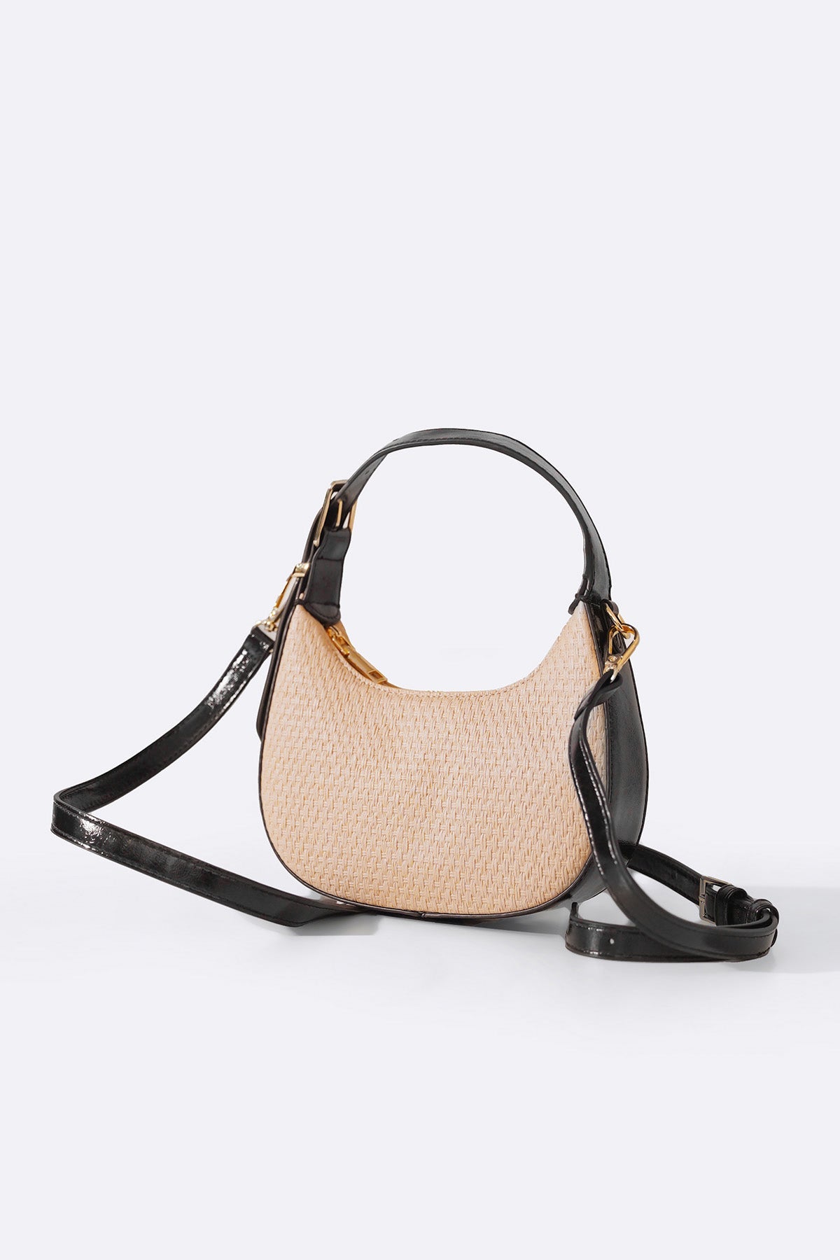 Soft textured mini top handle bag with a detachable and adjustable strap, and fine gold accessories with a zip on top to hold your belongings.