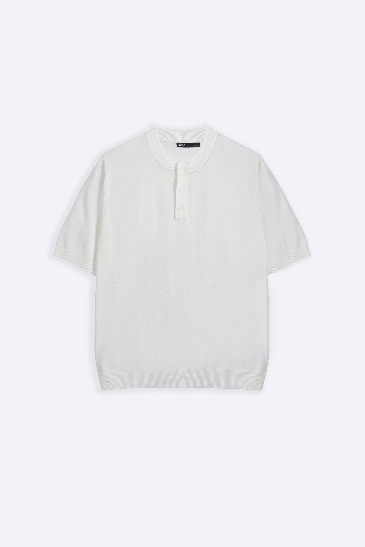 Design details: Short sleeved crew neck Henley. Ribbed neckline, sleeve