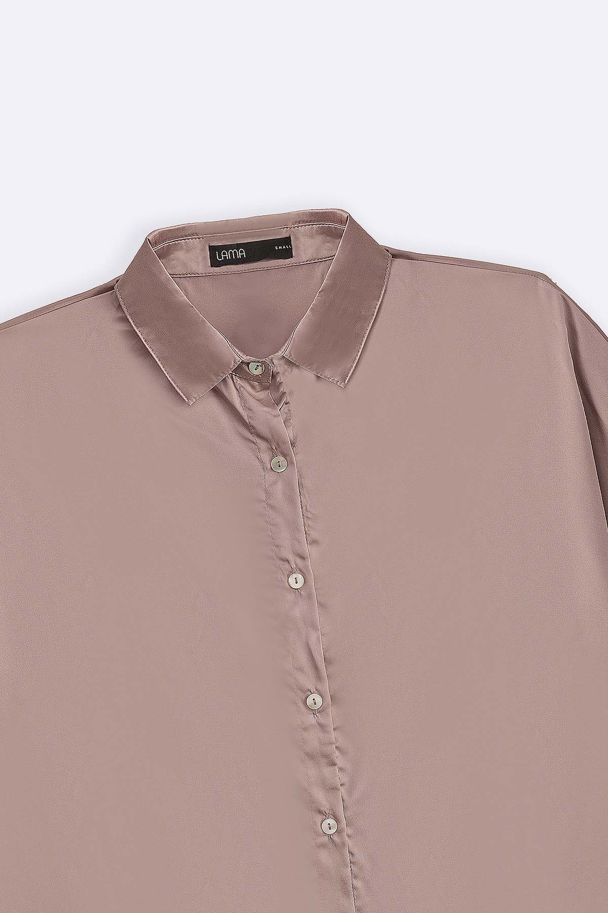 Design details: Collared blouse with short wide sleeves and front pearl button up closure.