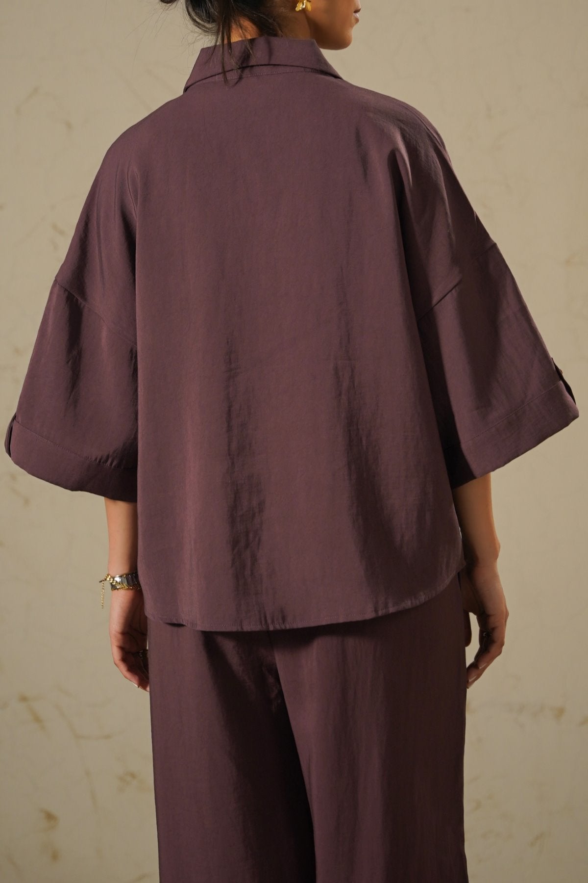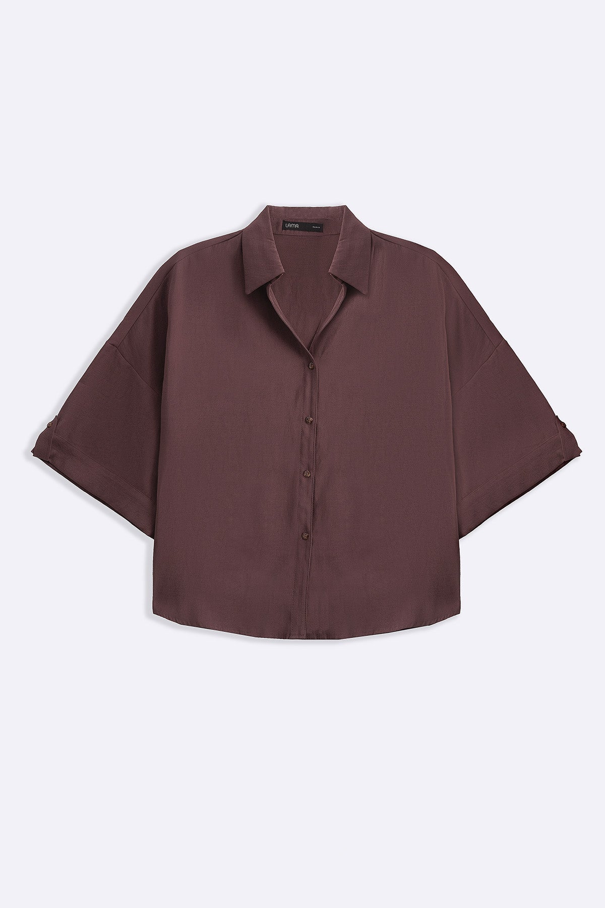 Design details: Collared V-neck shirt featuring short wide sleeves with loop detail, and front button up closure.