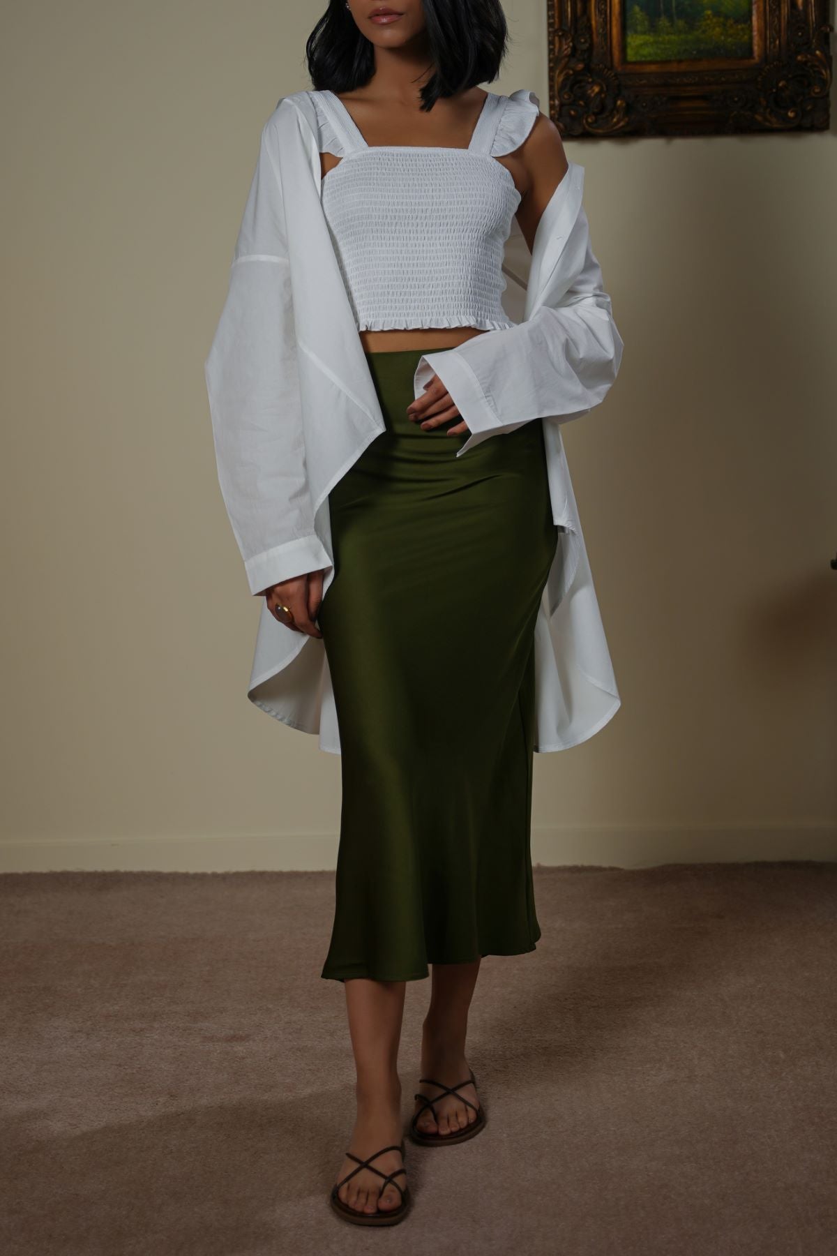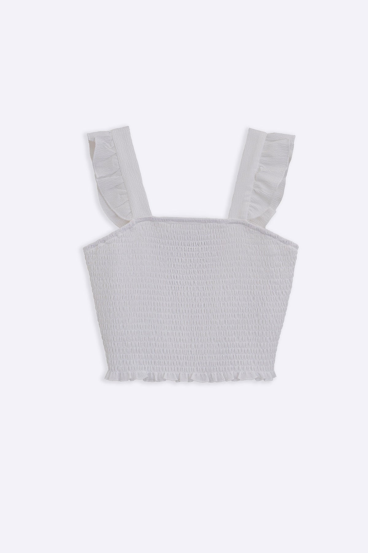 Design details: Smocked fitted top with a square neckline and ruffled straps.