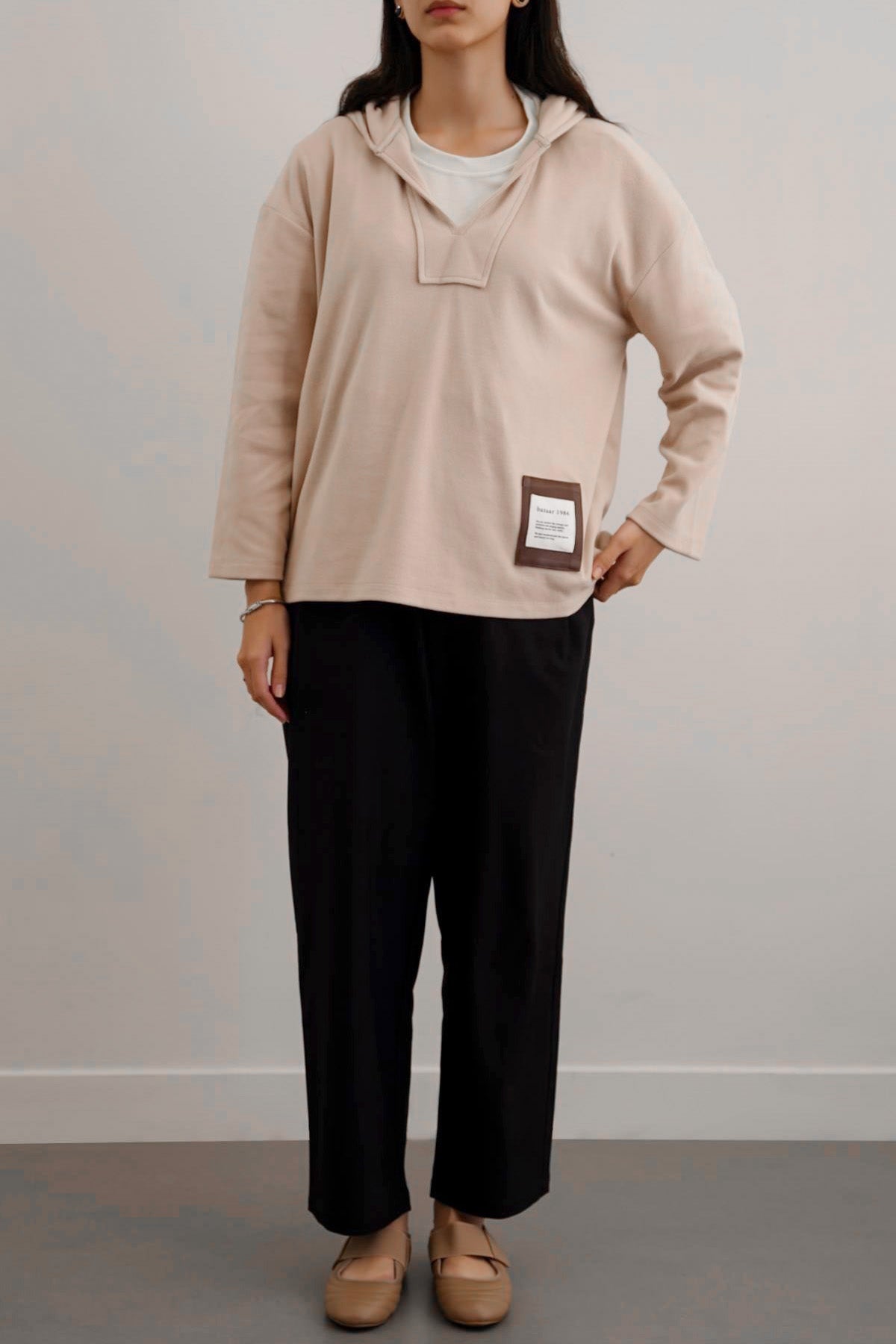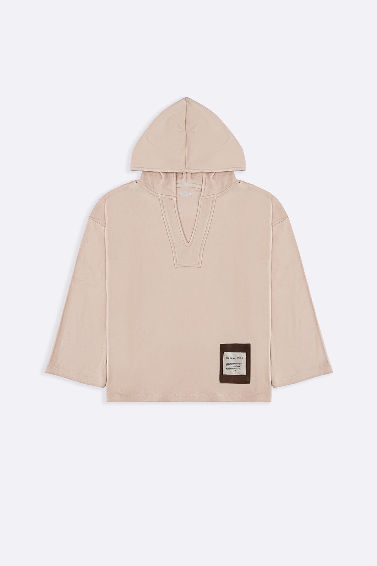 Design details: V-neck hoodie with long sleeves and a hood, along with front leather patch.