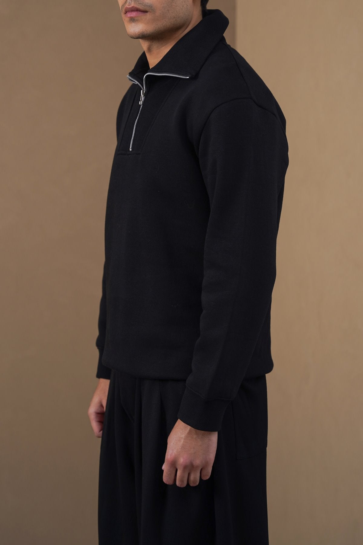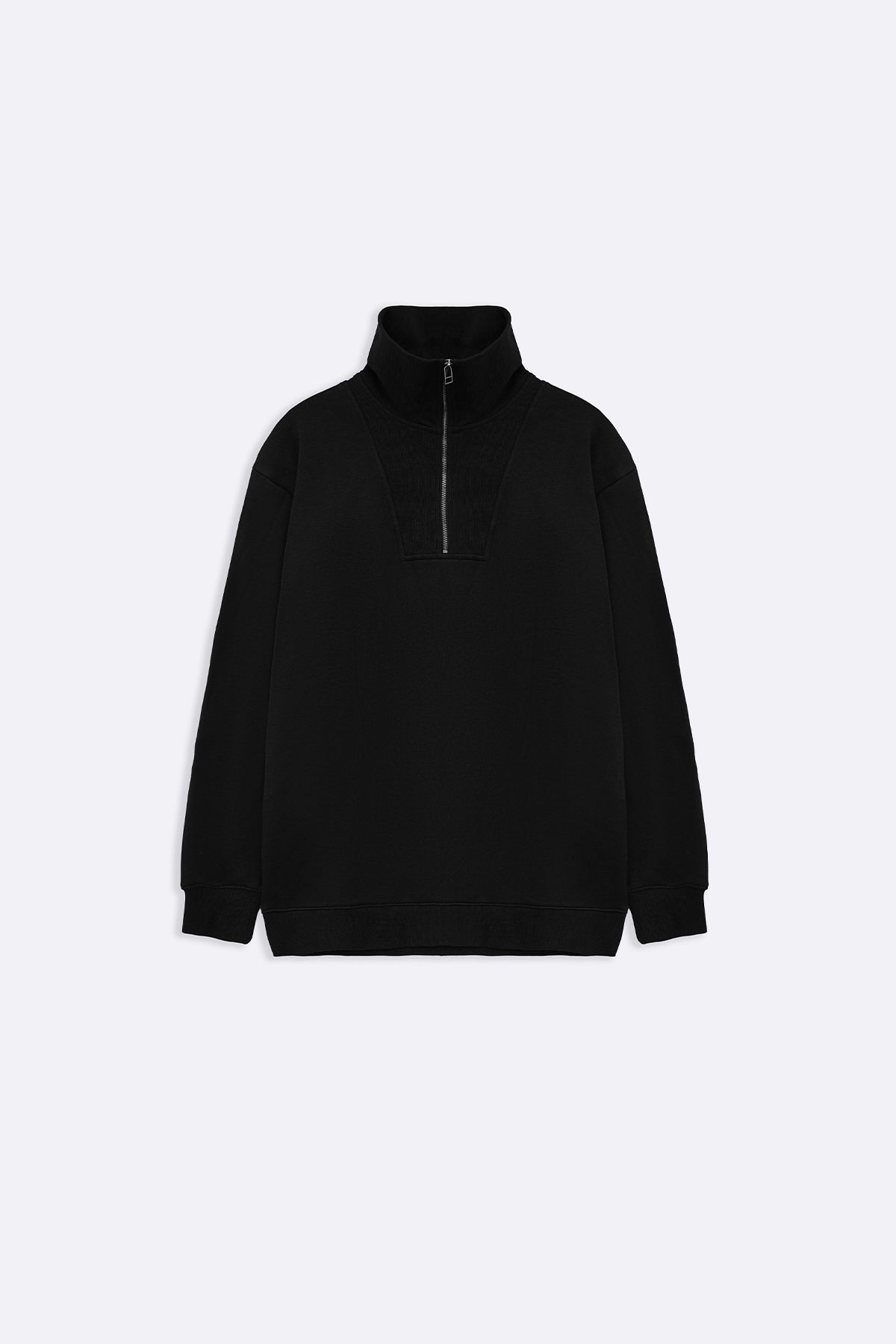 Design details: Mock neck sweatshirt with ribbed detailing on the neck area, with long sleeves and a quarter zip.